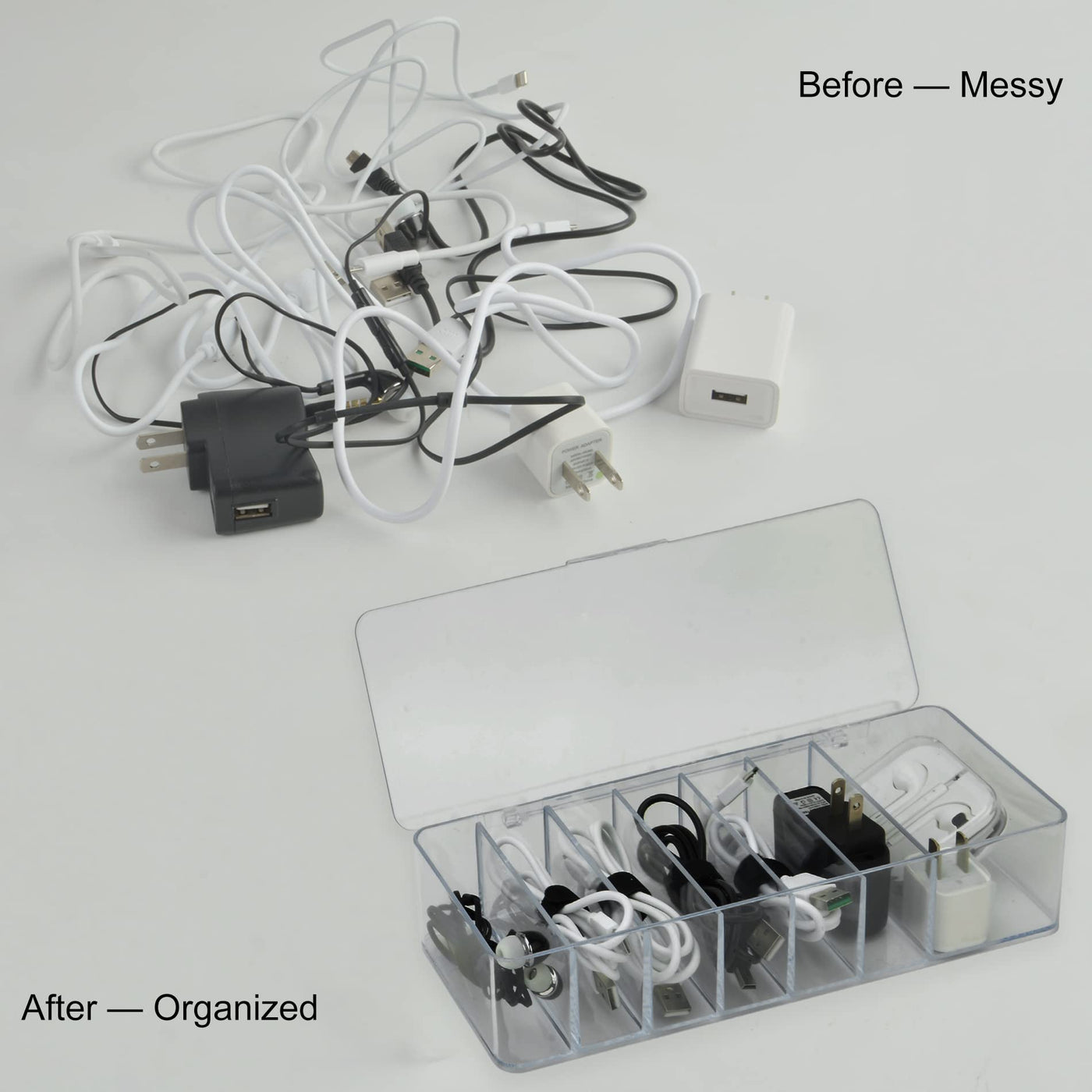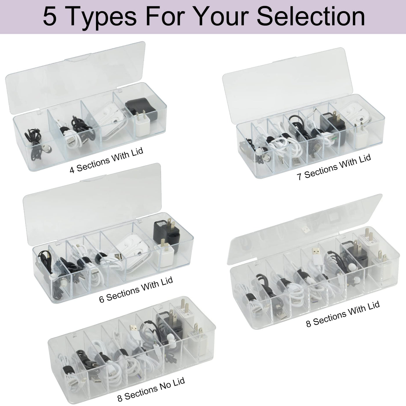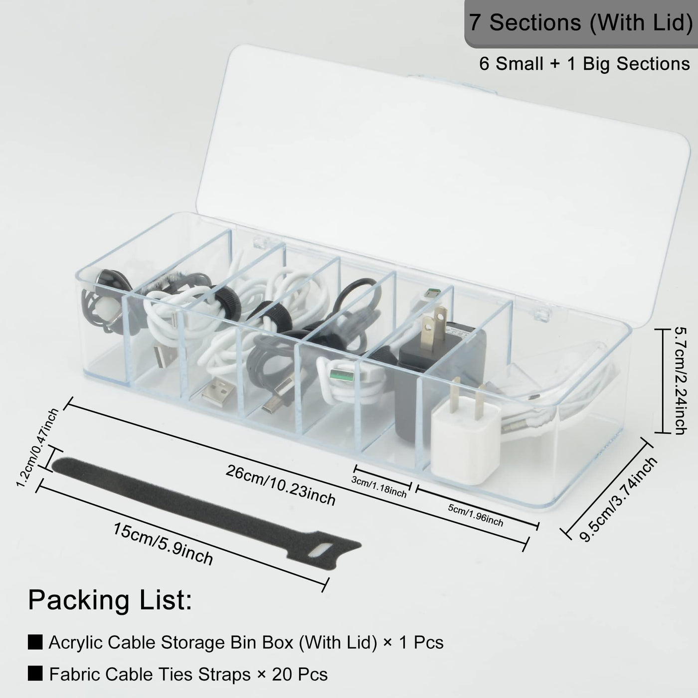 Electronics Organizer 7 Sections Clear Acrylic Cable Storage Bin Box Cord Holder with 20 PCS Reusable Fastening Fabric Cable Ties Straps Cord Wraps (7 Sections/with Cover) 7 Section / With Lid