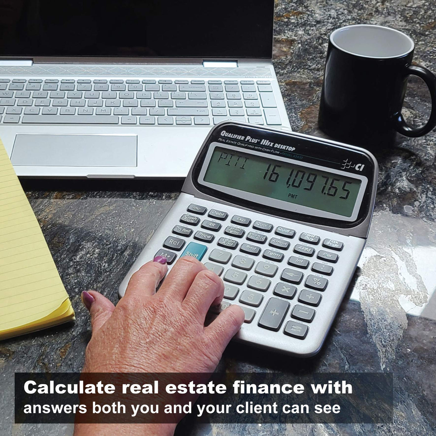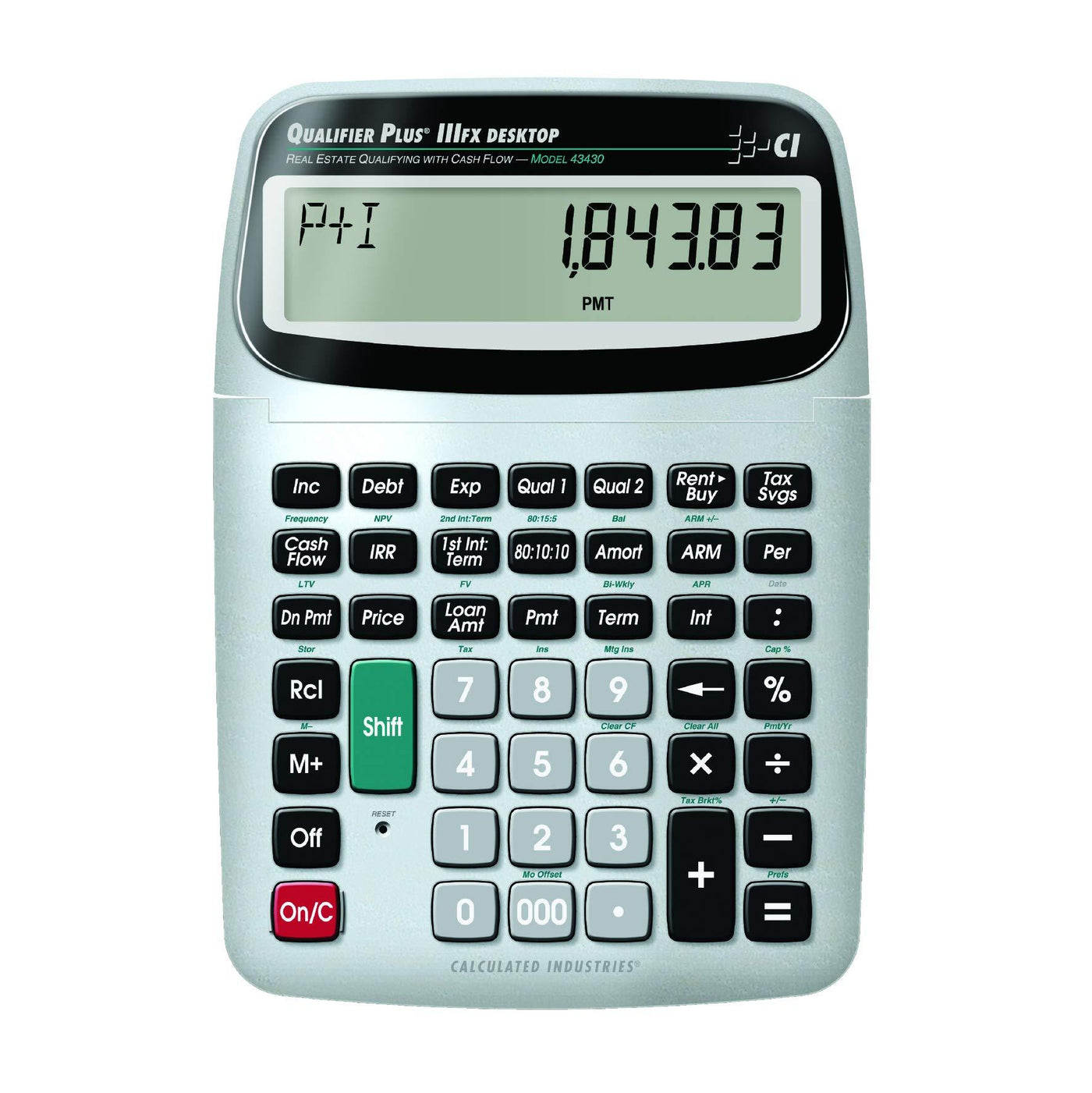 The Qualifier Plus IIIfx-Desktop is the ideal real estate calculator for agents, brokers, loan officers and originators. It helps you determine real estate financial answers that both you and your client can see. You can perform mortgage loan and financing problems with ease. Use the calculator to determine time-value-of-money problems as well as find loan amount, term, interest, payment and future value. It lets you include property tax, homeowner’s insurance, and mortgage insurance so you can calculate accurate loan requirements. You can use the calculator for your owner/buyer clients in addition to your clients who are looking to rent with rent vs buy and tax-savings calculations. The calculator helps you determine your commission, figure out reduction of listing price and date of escrow closing. It’s like having a financial professional on your desk.Built-in date math function for closing and expiration dates Solve real estate finance and investment problems quickly and conveniently using the Qualifier Plus IIIFX-DT calculator from Calculated Industries. This large, desktop calculator is made specifically for real estate agents and investors and includes advanced functions to pre-qualify buyers, make tax and mortgage calculations, determine cash flows, and accomplish other related tasks. The Qualifier Plus includes a protective slide cover and also serves as a standard calculator. 43430 Desktop Qualifier Plus IIIFX DT Real Estate Finance CalculatorAt a Glance: Dedicated functions to make real estate finance and investment calculations Has an adjustable, nine-digit LCD display Automatic shutoff helps preserve battery life Backed by a one-year warranty Made for real estate agents and investors, this calculator helps you find answers to common and advanced real estate problems (view larger). The calculator features an adjustable, nine-digit, easy-to-read LCD display (view larger). Make Common Real Estate Calculations with EaseWith the Qualifier Plus IIIFX-DT calculator, you can quickly qualify potential homebuyers, find the answers to common real estate finance and investment problems, and serve real estate clients in a fast, professional manner. This tool can calculate multiple cash flows and internal rates of return, along with net present and net future values, and it allows you to make a variety of advanced loan, payment, tax, insurance, and investment calculations. Product InformationThe Qualifier Plus IIIFX-DT features an adjustable, nine-digit LCD display and large plastic keys, including a special triple-zero key to help you save time and keystrokes. This product measures 9.0 by 6.4 by 1.4 inches (H x W x D), weighs 10.8 ounces, and is powered by a 3-volt lithium battery (included) that delivers up to approximately 3,000 hours of use. An automatic shutoff helps preserve battery life. The LCD measures 1.6 by 5.3 inches (H x W). About Calculated IndustriesFounded in 1978, Calculated Industries (CI) is the country's leading manufacturer and marketer of specialty construction calculators and digital measuring tools. For over 30 years, CI's products have helped more than 8 million busy professionals work better, faster, and more efficiently with easy-to-use, portable solutions. What's in the BoxOne Qualifier Plus IIIFX Desktop calculator; one 3-volt lithium battery; and one pocket user's guide P.when('A').execute(function(A) { A.on('a:expander:toggle_description:toggle:collapse', function(data) { window.scroll(0, data.expander.$expander[0].offsetTop-100); }); }); From the Manufacturer Advanced residential real estate finance calculator with cash flow and complete buyer qualifying. The Qualifier Plus IIIFX DT is the ideal tool for real estate investors, agents and mortgage lenders. In addition to both common and advanced real estate finance problems, it calculates multiple cash flows and internal rate of return (IRR), as well as net present and net future values (NPV/NFV). Provide fast and accurate investment solutions, without complicated formulas. The Qualifier Plus IIIfx DT offers all the features of the hand-held calculator in a convenient desktop model. Large keys and an easy-to-read, adjustable display make it perfect for office use. See more