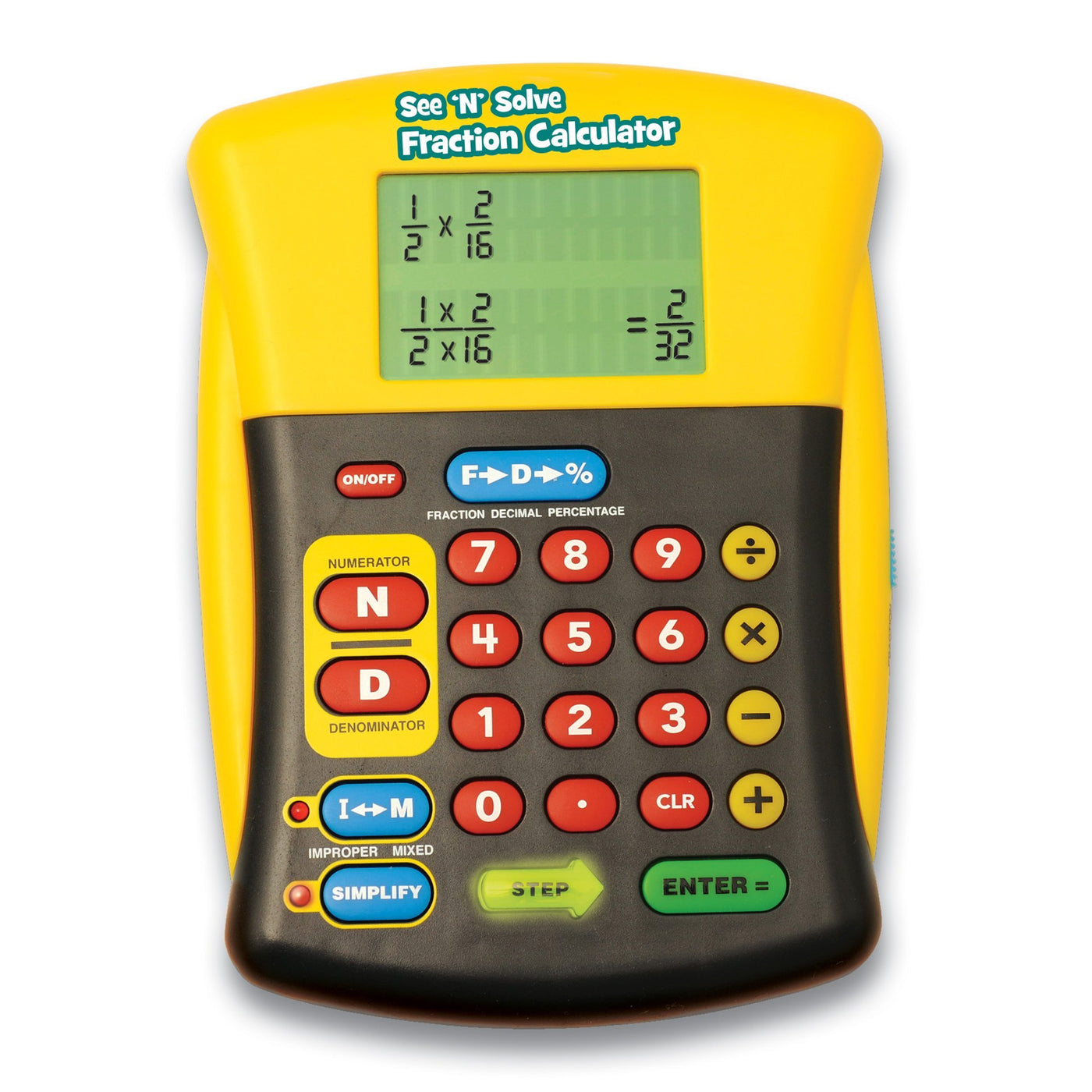 The See ‘n’ Solve Fraction Calculator is the only user- friendly calculator on the market that shows students how to solve a fraction problem, step by step. The easy-to-use format reinforces introductory fraction skills without the complications of other scientific calculators—making it perfect for school and home. Students can add, subtract, multiply, and divide fractions easily. Press the special Numerator and Denominator keys to input a fraction problem. The large 2-line screen displays the problem (with common denominator), and lighted keys guide students through the steps to solve it. Special keys instantly simplify fractions or convert fractions to decimals or percentages. A terrific way for students to see and understand how to solve any fraction problem. Requires 2 AA batteries (not included). From the Manufacturer The See ‘n’ Solve Fraction Calculator is the only user-friendly calculator on the market that shows students how to solve a fraction problem, step by step. The easy-to-use format reinforces introductory fraction skills without the complications of other scientific calculators—making it perfect for school and home. Students can add, subtract, multiply, and divide fractions easily. Press the special Numerator and Denominator keys to input a fraction problem. The large 2-line screen displays the problem (with common denominator), and lighted keys guide students through the steps to solve it. Special keys instantly simplify fractions or convert fractions to decimals or percentages. A terrific way for students to see and understand how to solve any fraction problem. Requires 2 AA batteries (not included).