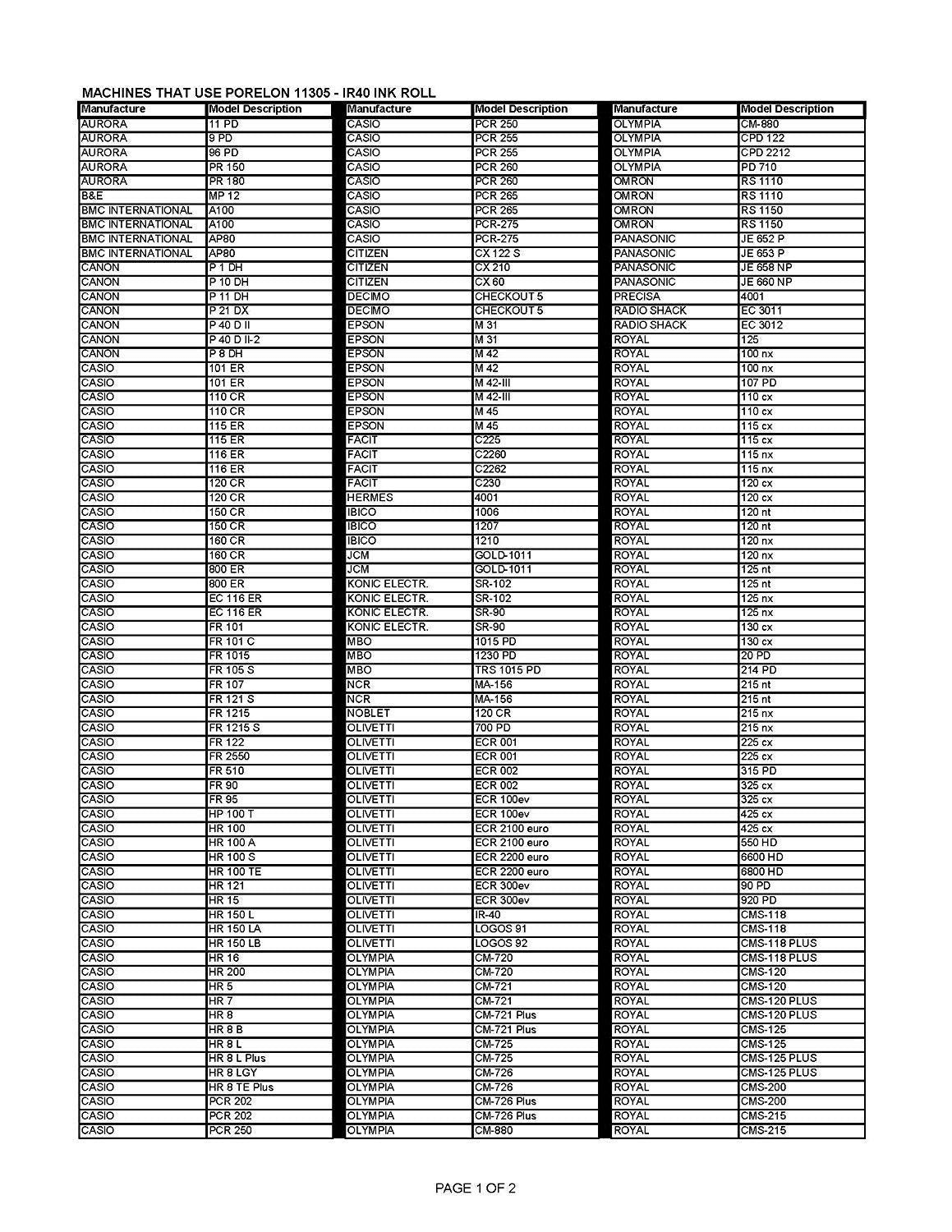FJA Products offers a New Compatible CP16 Ink Roller (2 pack) that replaces several popular models. Replaces, CP16, IR40, PR40, IR30, EA-770R, VPR40, NR40P2 The ink roller will work in all of the following: CANON P1DH ● CANON P1DHV ● CANON P10DH ● CANON P11DH ● CANON P21DX ● CANON P40DII ● CANON P40DII2 ● CANON P8DH ● CASIO 101ER ● CASIO 110CR ● CASIO 115ER ● CASIO 116ER ● CASIO 120CR ● CASIO 150CR ● CASIO 160CR ● CASIO 800ER ● CASIO EC116ER ● CASIO FR101 ● CASIO FR101C ● CASIO FR1015 ● CASIO FR105S ● CASIO FR107 ● CASIO FR121S ● CASIO FR1215 ● CASIO FR1215S ● CASIO FR122 ● CASIO FR2550 ● CASIO FR510 ● CASIO FR90 ● CASIO FR95 ● CASIO HP100T ● CASIO HR100 ● CASIO HR100A ● CASIO HR100S ● CASIO HR121 ● CASIO HR15 ● CASIO HR150L ● CASIO HR150LA ● CASIO HR150LB ● CASIO HR16 ● CASIO HR200 ● CASIO HR5 ● CASIO HR7 ● CASIO HR8 ● CASIO HR8B ● CASIO HR8L ● CASIO HR8LPlus ● CASIO HR8LGY ● CASIO HR8TEPlus ● CASIO PCR202 ● CASIO PCR250 ● CASIO PCR255 ● CASIO PCR260 ● CASIO PCR265 ● CASIO PCR275 ● CITIZEN CX122S