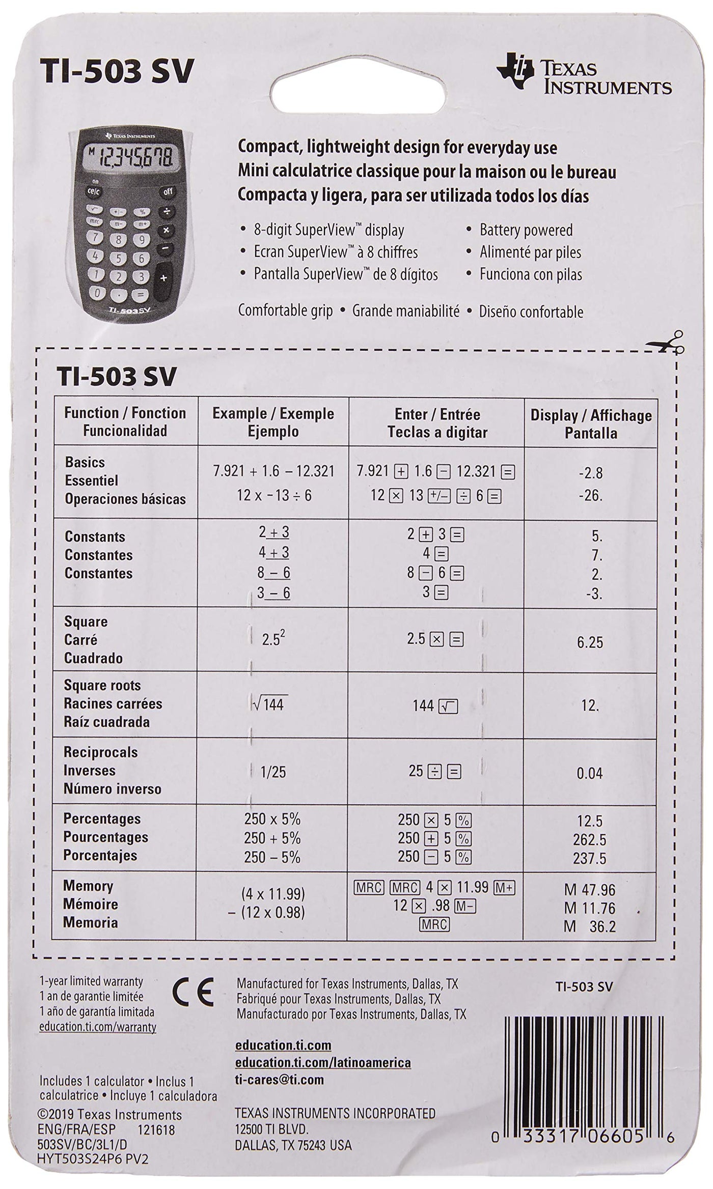 Pocket-size calculator with large display. An indispensable tool for students, households, and offices for quick math calculations, figuring finances, or converting cooking measurements, the TI-503SV pocket calculator is always at the ready with its large clear LCD, three-key memory, and battery-conserving operation. This compact unit measures just 5 by 3 by 0.5 inches and has a +/- switch key to simplify entering negative numbers. The 7-millimeter-tall character display is easy to read, and the soft large keys are comfortable to operate. The sizable eight-digit display is not sacrificed to the small size. Easy to use when traveling, in the kitchen, classroom, or home office, the TI-503SV is so economical you can have one in each room. Plus, an automatic shutoff feature conserves battery life. P.when('A').execute(function(A) { A.on('a:expander:toggle_description:toggle:collapse', function(data) { window.scroll(0, data.expander.$expander[0].offsetTop-100); }); }); From the Manufacturer This compact, economical calculator works well for either handheld or desktop use. It offers pocket-size convenience with a giant eight- digit SuperView display that provides easy, on-the-spot answers. The roomy keyboard has well-spaced rubber keys. The change sign (+/-) key simplifies entering negative numbers. The unit is battery powered for operation anywhere. The automatic power down (APD) feature conserves battery life. See more