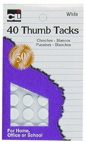 Color:White | Size:40-Pack Thumb tacks feature rust resistant, brass plated finish, with colorful painted caps. White, 3/8" head, 5/16" point.