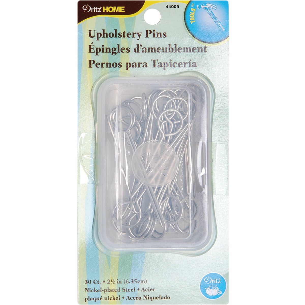Dritz Home Upholstery Pins. Complete your upholstery projects conveniently, using the Dritz Home Upholstery Pins. This package includes 30 Ct. size 2-1 - 2" upholstery pins that suit all your upholstery or decorating needs, and come in a handy clear plastic storage container. These nickel-plated steel pins have a round top for better grip and they can hold together multiple layers of fabric. Perfect for heavy-weight fabrics these pins are a fabulous addition to your home improvement kit. .