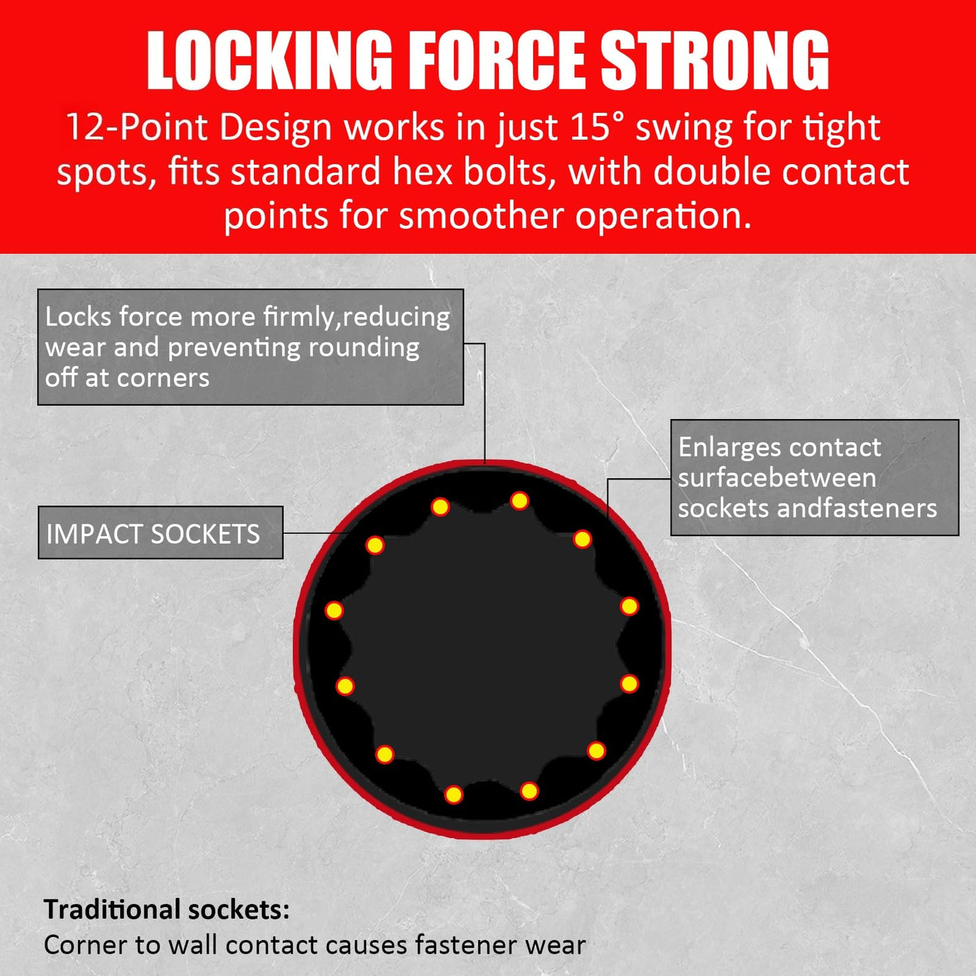 - (12-POINT SOCKET DESIN)Compatibility & Efficiency: 12-point design works in just 15 swing for tight spots; fits standard hex bolts, with double contact points for smoother operation.