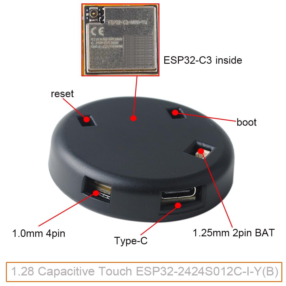 - ESP32-2424S012C-I-Y(B) module is the combination of ESP32-C3 development board + 1.28" capacitive touchscreen ips display.
