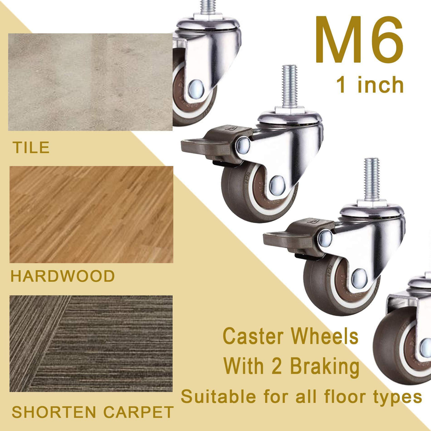 Description: Perfect casters with brakes(2 with brakes, 2 without brakes) for small equipment and small space furniture including coffee table, plant stands, bookshelves, shoe bins, toy bins, shopping carts, workbench. Soft rubber wheels offer the toughness and durability. It is suitable for all floor types. Specifications: Wheel Diameter: 25mm / 1.0inch. Capacity: 15kg / 33lb per wheel. Style : Swivel with brake, Threaded Stem. Install Type: Threaded Stem. Thread Diameter: 5.8mm / 0.22inch. Thread Length: 15mm / 0.59inch. Wheel Material: Soft rubber & TPE. Color: Coffee. Package Include: 4 x M6 Threaded Stem Caster Wheels with Brakes1 x Mini wrenchNote: Each caster capacity is 20kg, total capacity for all 4 casters is 60kg (calculated by 3 casters ). Because when the ground is uneven, there will be only 3 casters bearing weight.Attention: Please check the thread size when purchasing and confirm that the thread size is correct.