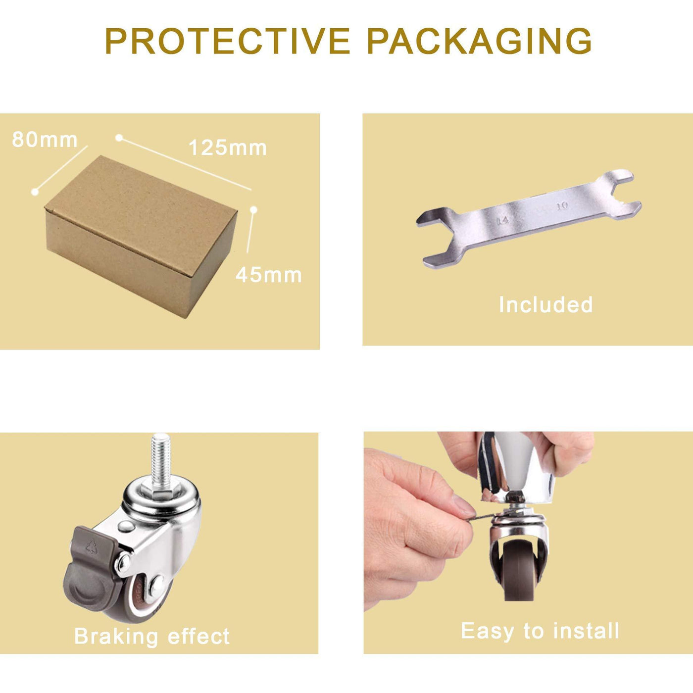 - Perfect casters with brakes for small equipment and small space furniture including coffee table, plant stands, bookshelves, shoe bins, toy bins, shopping carts, workbench,Packing included 1 Mini Wrench