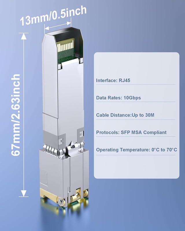 - Fast Transmission10G SFP+ to RJ45 Ethernet copper transceiver supporting 10Gb/s data rates for CAT6a/CAT7/CAT8 cables up to 30 meters and compliant with SFF-8431 and SFF-8432 MSA industry standards.