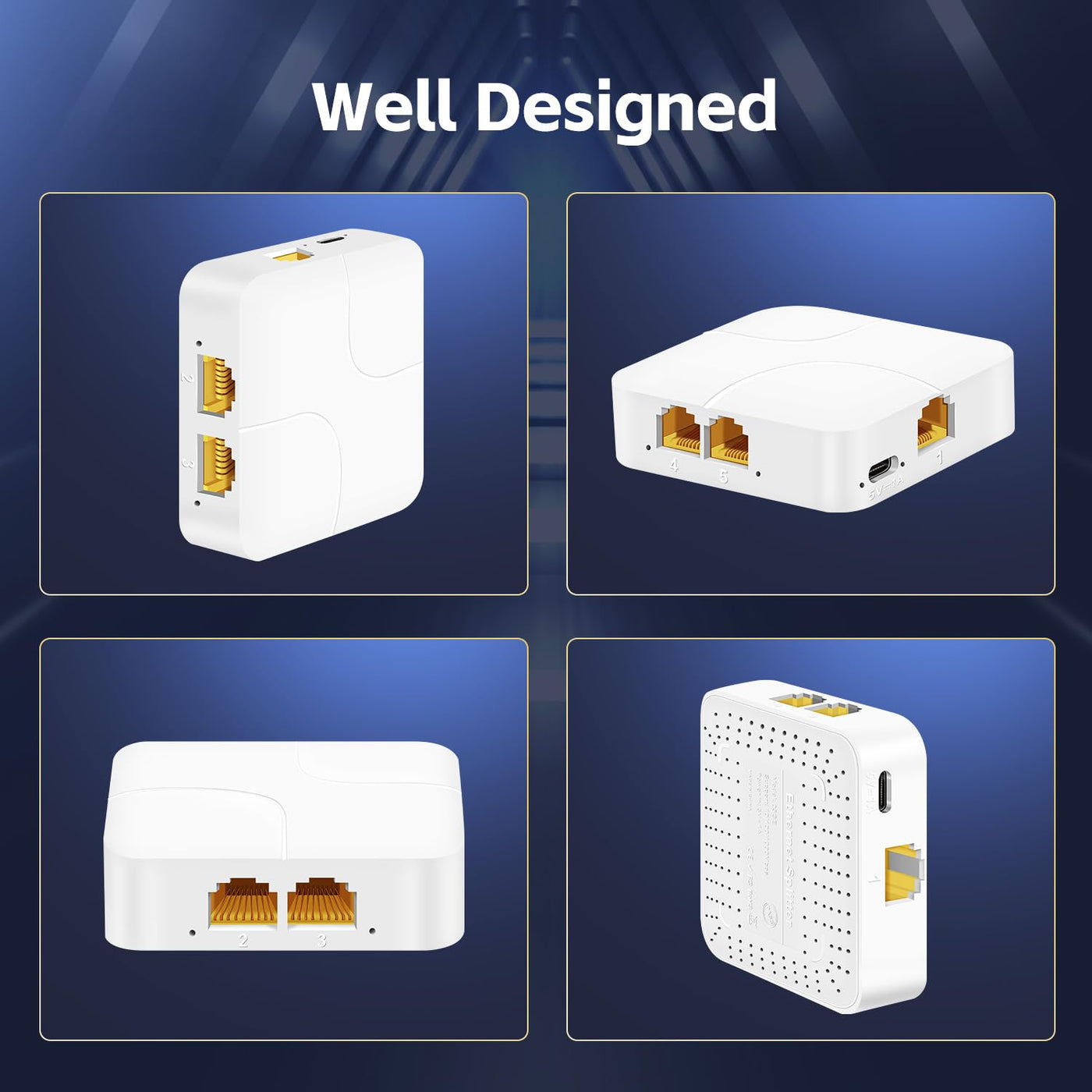 - Gigabit Ethernet SplitterThe network splitter includes 5 Gigabit ports, 1 in and 4 out, supports 10/100/1000Mbps rate adaptive. This high-performance splitter allows you to expand your network without need for additional cables.