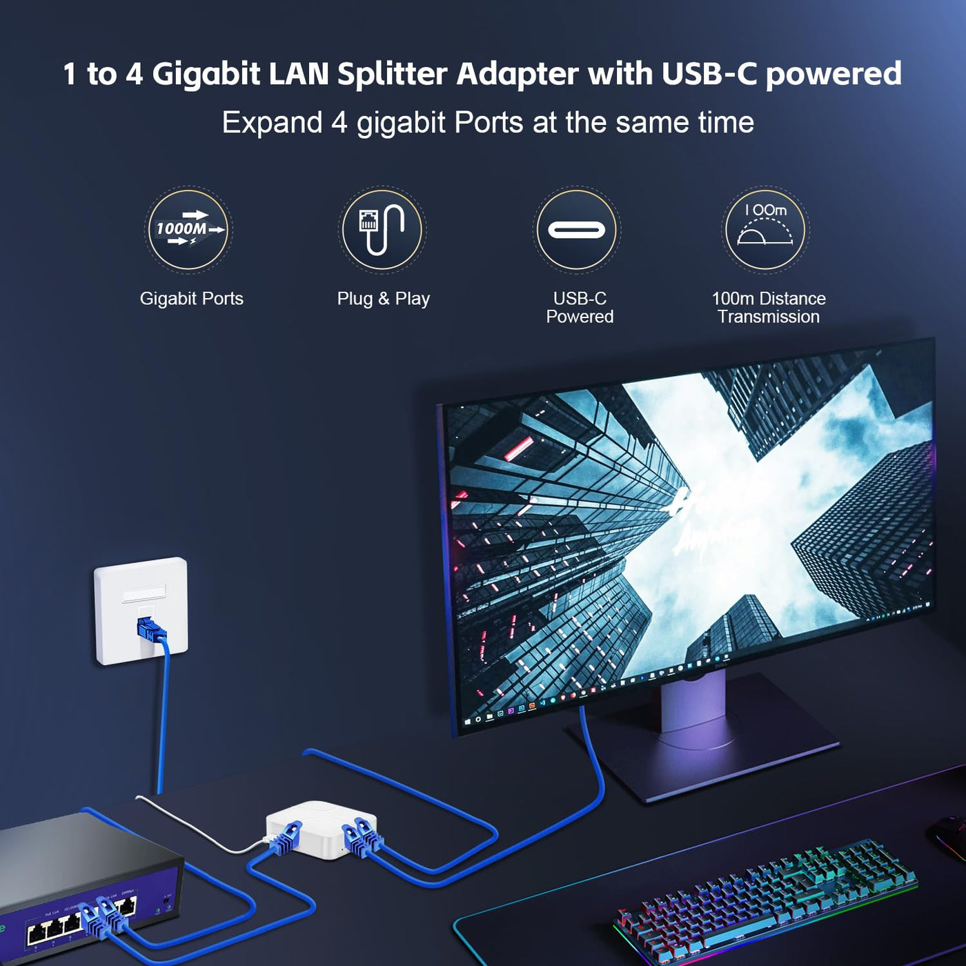 1 to 4 Gigabit Ethernet Splitter, 100/1000Mbps, Network Hub RJ45 Internet LAN Splitter with USB Cable, for Cat5/5e/6/7/8 Cables