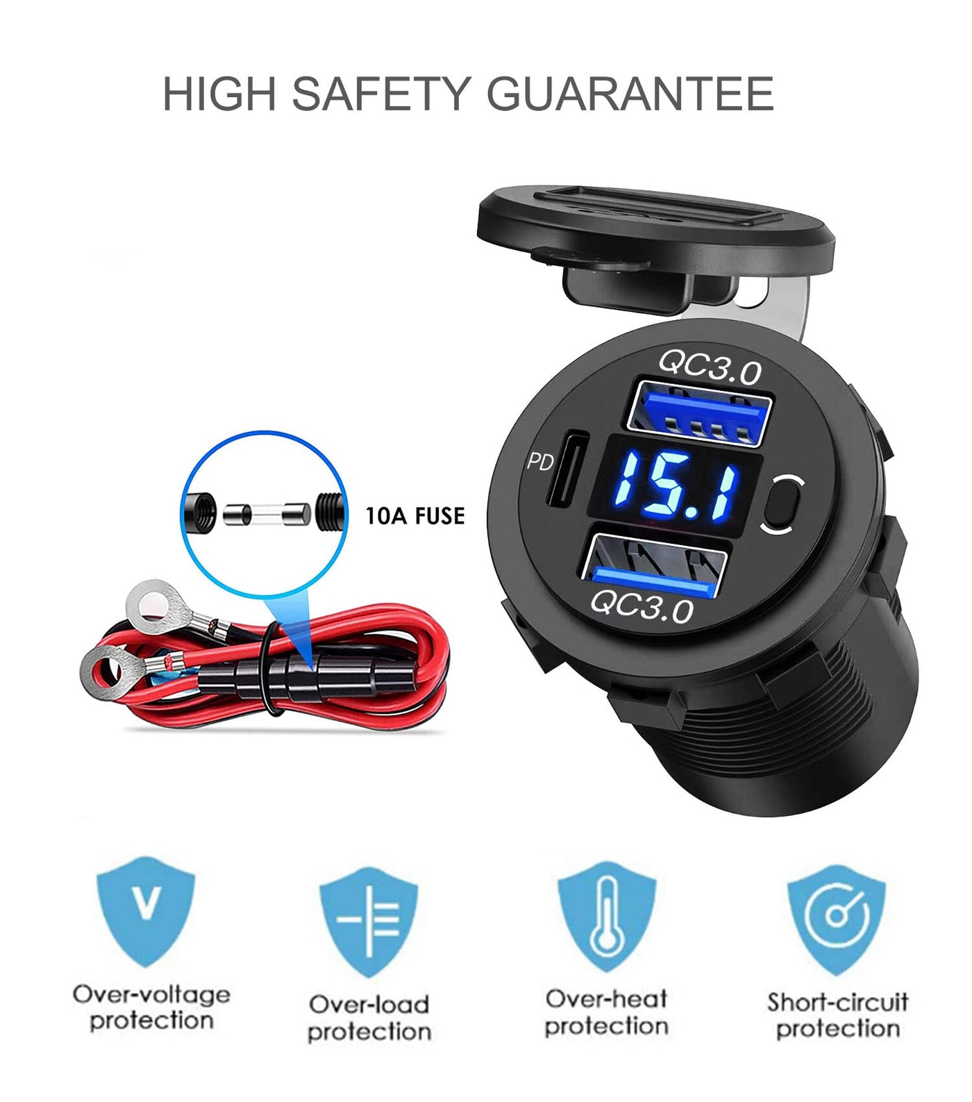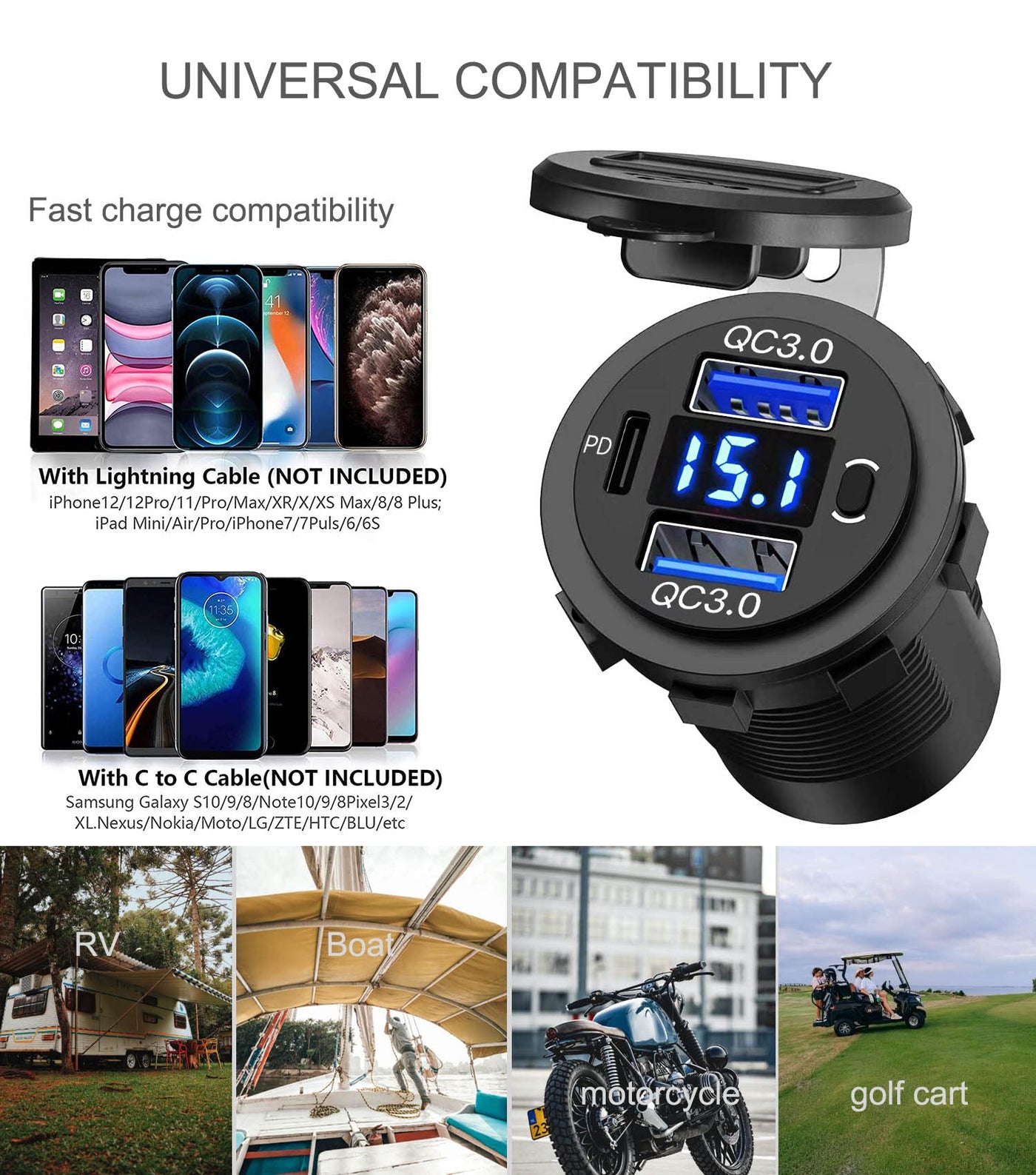 - Universal CompatibilityPerfect for Car Marine Motorcycle Golf Cart ATV RV etc. Supports all mobile phones, tablets, Video Games Controllers, Power Banks and more. (NOTE: PD port does not support laptops charge)