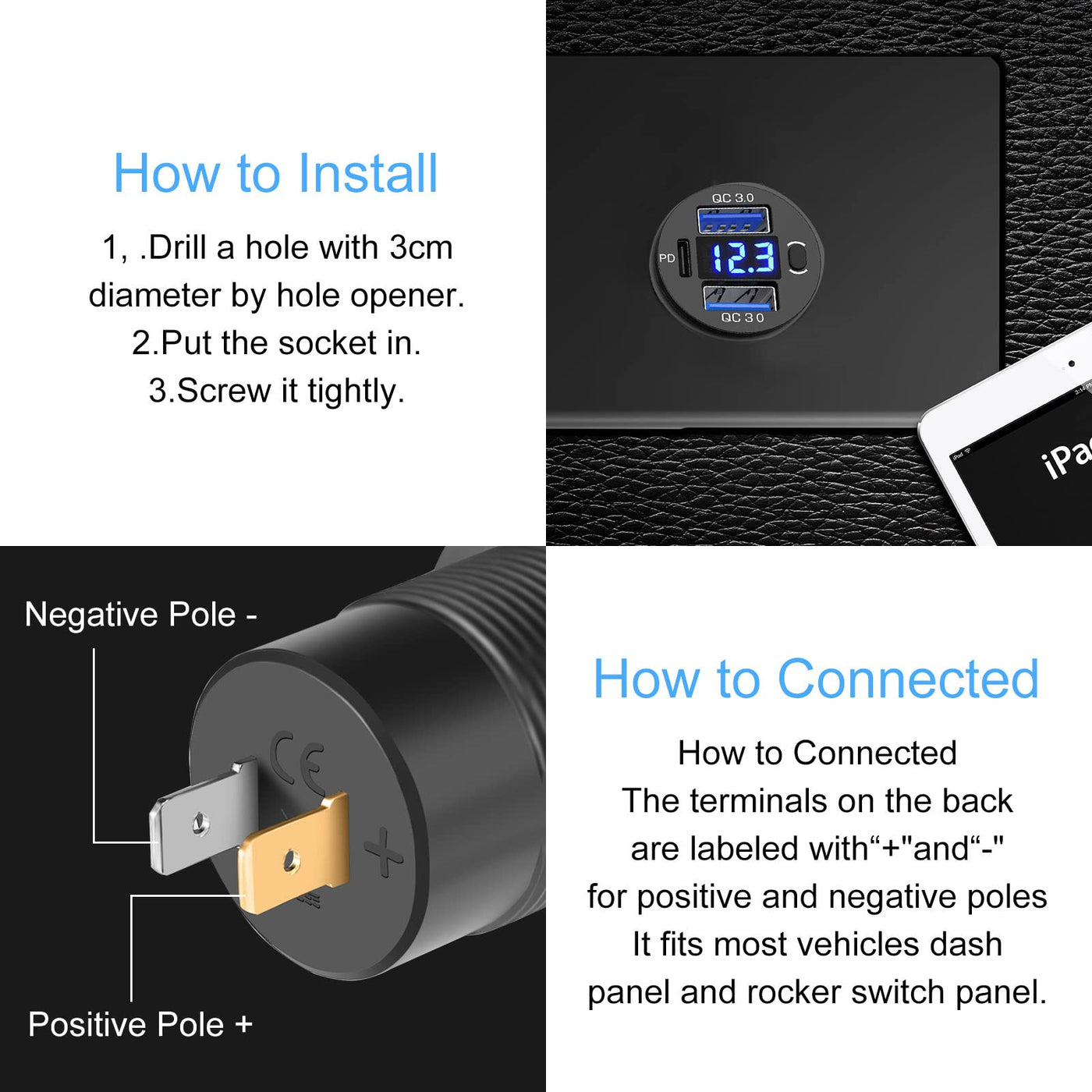 - Dual QC 3.0 + 1PD usb port36W Dual usb Quick Charge 3.0 port and a USB C prot,Charge three devices at the same time, multi-port design can help you meet your requirements