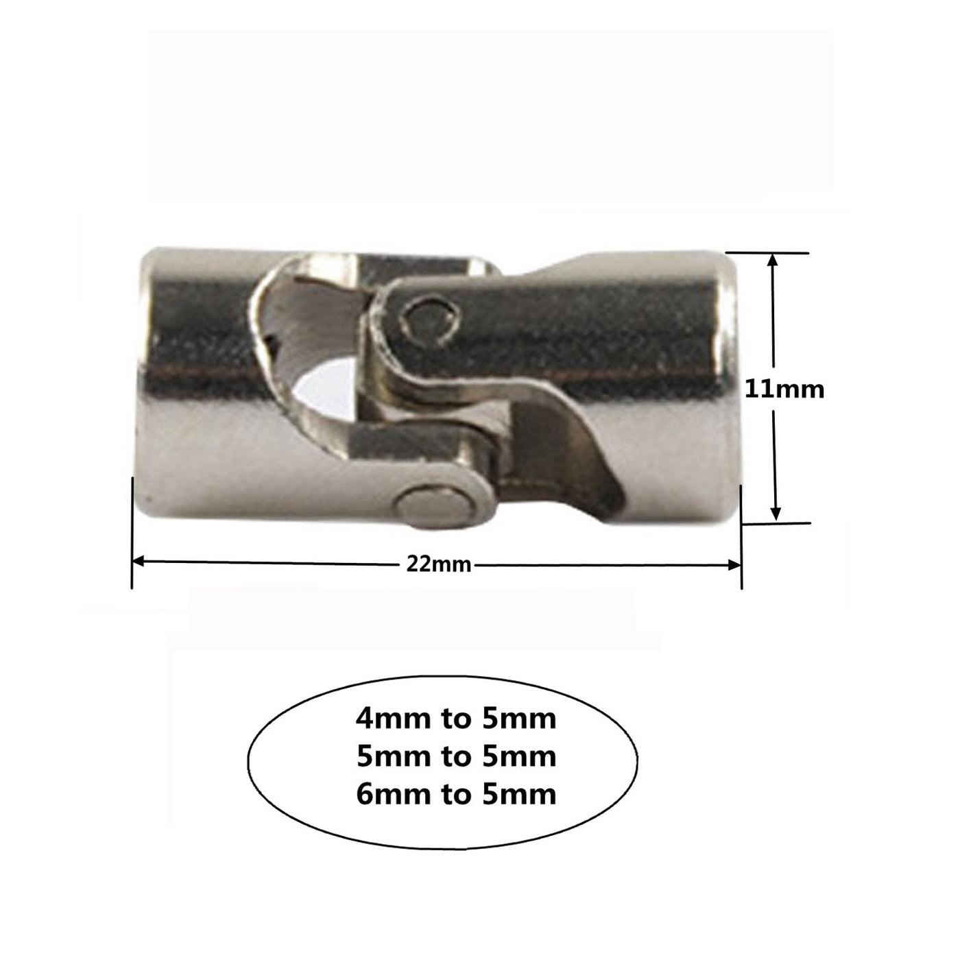 Feature: Made of stainless steel,durable. 360 degree rotatable universal joint. Ideal accessories for RC Model motor, such as airplane boat model. Metal joints for use in direct-axis motor, motor for the brush motors and small brushless motor. Parameters: 4mm to 5mm: Hole diameter:one is 4mm,the other is 5mm. Universal joint outside diameter:11mm Universal joint length:22mm Holding screw size:M4 Package include: 2 x Universal joint(4mm to 5mm) 4 x Holding screw Note: The color of the item may vary slightly due to photography and your own computer