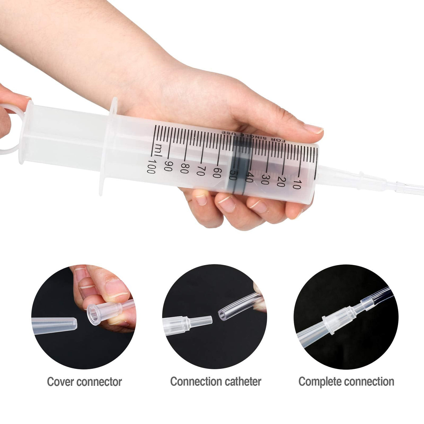 TECHNICAL SPECIFICATIONS: Material: Plastic Available colors: White syringe with black scale Type: Syringe without needle Capacity: 100ml Syringe diameter: 3.6cm Length: 20cm PACKAGE INCLUDED: 100ml syringe × 2 black tip plug × 2 connector adapter × 2 1 meter catheter × 1 DESCRIPTION: 1. Independently sealed syringes are used for industrial purposes only, however, are not suitable for medical injections. Use with caution. 2.The white plug is a small part that is inside the syringe without any accessories missing. 3. The syringe without needle can be used for sucking motor oil, transferring liquids in laboratories and feeding animals. GUARANTEE: 1.We adhere to Amazon's return policy. 2. Within 30 days, if there are any quality problems, we will take full responsibility. 3. Any damage that occurred during the delivery time will be charged by us.