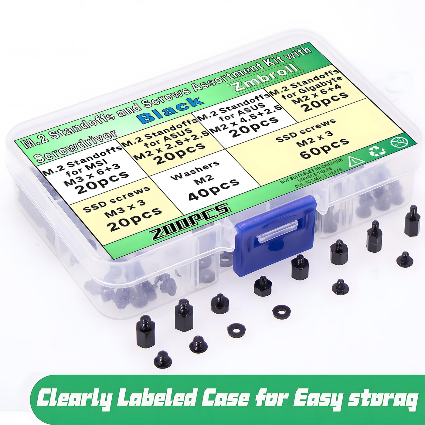 Package Includes: 200pcs black Computer Screws in a handy box Content: M.2 Standoffs for MSI M3 x 6+3 --- ---20pcs M.2 Standoffs for ASUS M2 x 2.5+2.5 --- ---20pcs M.2 Standoffs for ASUS M2 x 4.5+2.5 --- ---20pcs M.2 Standoffs for Gigabyte M2 x 6+4 --- ---20pcs M3x3 SSD screws --- ---20pcs M2x3 SSD screws --- ---60pcs M2 washers --- --- 40pcs magnetic screwdriver --- --- 1pc Specification: Product Name: Black M.2 SSD Screws Material:carbon steel with a zinc-plated Color: Black Screws Head Style: Flat Screw Type: Phillips Our computer screws and standoff kit are designed specifically for securely mounting solid-state drives (SSDs) in computer systems.Choose our SSD mounting screws for their compatibility, precision construction, and ease of use. These screws are designed to facilitate the secure installation of SSDs in your computer system, promoting efficient data storage and overall system performance. Notification: 1.Please read the detail sizes carefully before buying! 2.Small Parts, not suitable for children