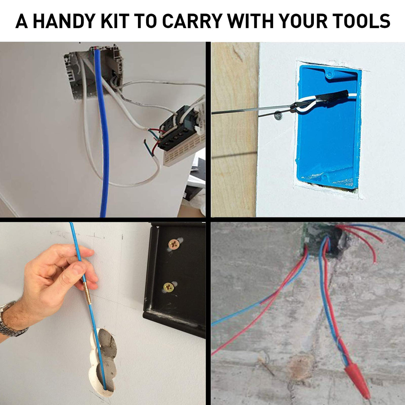 50' Fiberglass Cable Wire Running Rod Coaxial Electrical Connectable Fish Tape Pull Kit With Hook And Hole Kit In Transparent Tube, Blue