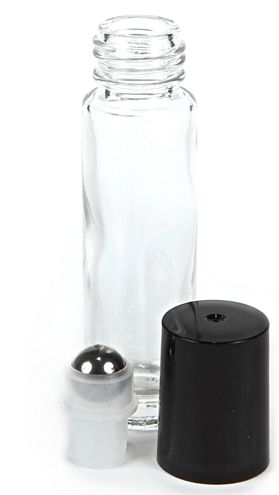 - 6 clear, glass, roll-on bottles with Stainless Steel Roller Balls & black caps.