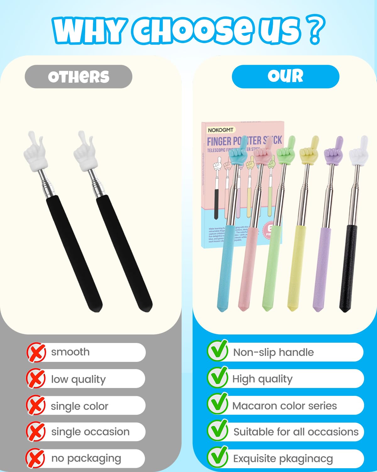 - Engaging & Colorful Design Brighten any lesson or presentation! This finger pointer stick set features 6 delightful macaron colorsWhite, Pink, Green, Yellow, Blue, and Purplepaired with an adorable little hand shape and smooth, rounded edges to make learning more interactive and memorable.