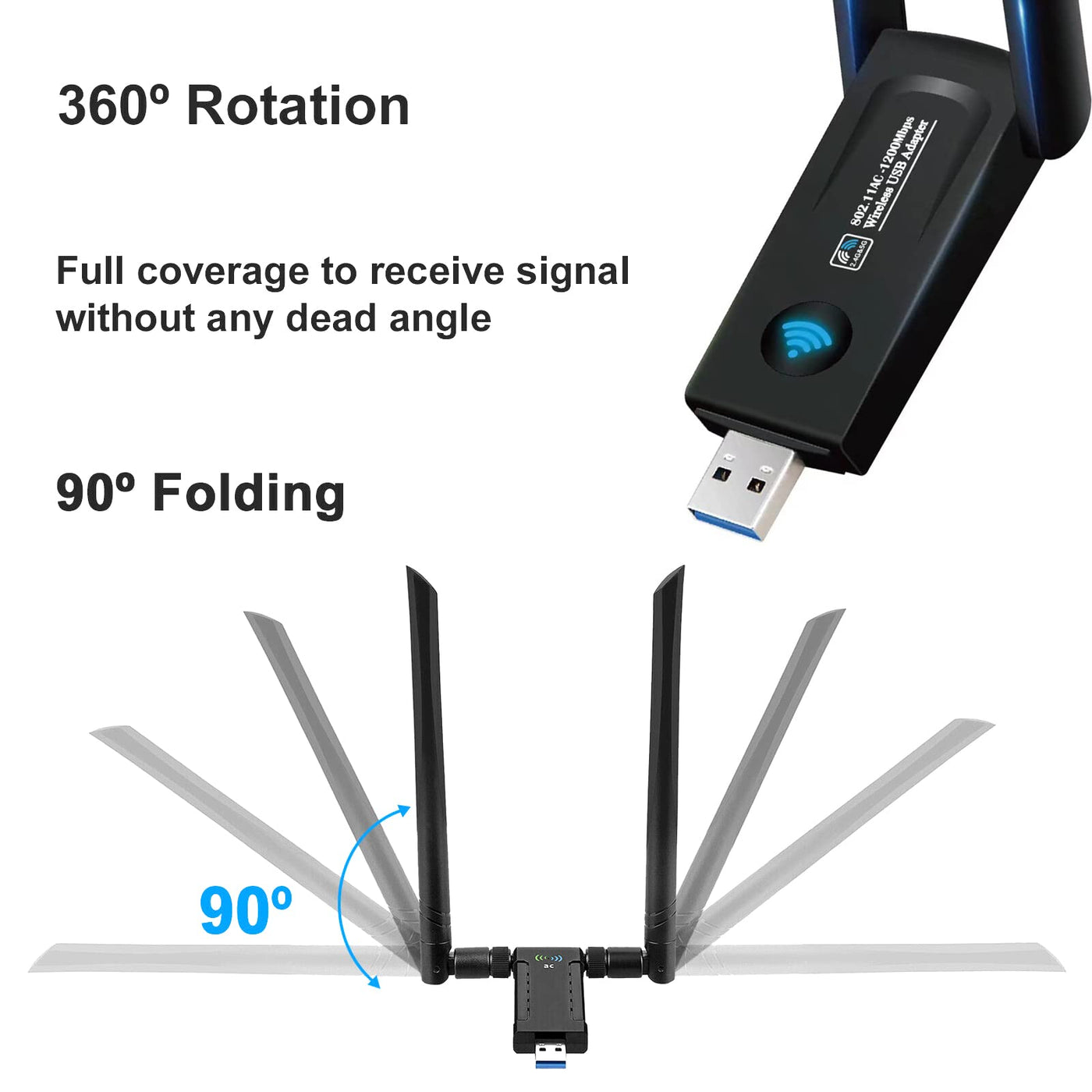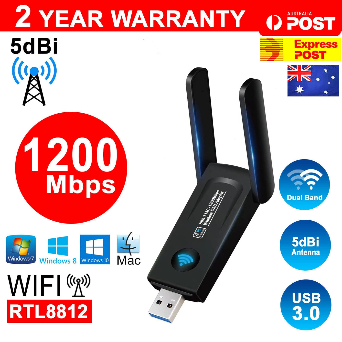 AC1200 High Power USB AC Wireless WiFi 5 Adapter Dongle 5dBi Dual Antenna 802.11AC