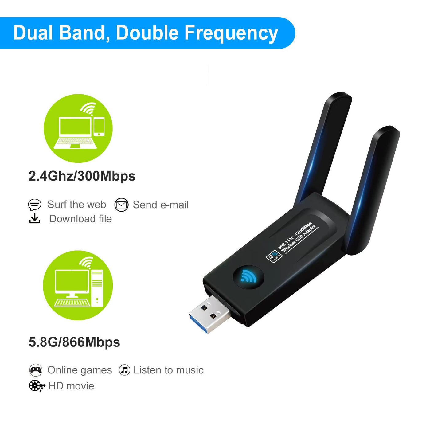 - Dual Band Connections, Supports up to 867Mbps on 5GHz Network and 300Mbps on 2.4GHz