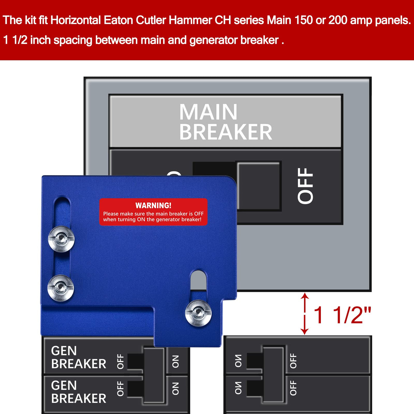 ACANORA Generator Interlock Kit for Horizontal Main Cutler Hammer CH Series 150 or 200 amp Panels Our interlock switch kit can prevent utility and generator power from being turned on at the same time.Our Interlock Kits In contrast to transfer switches, this kit does not require a separate generator breaker panel or special cover.The generator lock kit is made of heat-resistant and corrosion-resistant metal aluminum with surface oxidation treatment for long service life. Safety Interlock Switch Kit The interlock kit prevents utility and generator power from being turned on at the same time by sliding the interlock plate down and up.The generator lockout kit allow you to deliver power from the generator to any circuit within the electrical panel. You can know which circuit breakers to close or keep on during a power outage.In case of power failure, the interlocking kit can become a lifeguard and safely guide the portable generator power to any circuit in your home so that you can use electricity normally. Please first measure the distance between main and generator breaker before purchasing The kit for for Horizontal Main Cutler Hammer CH Series 150 or 200 amp Panels.Turn down, the main breaker is on, generator break must be off.Turn up, the generator break must be on, main breaker is off. Fit to Cutler Hammer CH and BR Series Fit to Square D QO or Homeline Fit to General Electric GE Interval Space Required 1 1/4-1 7/16 inch 1 3/8 inch 1 1/4 inch 150 or 200 amp Main Panels ✓ ✓ ✓