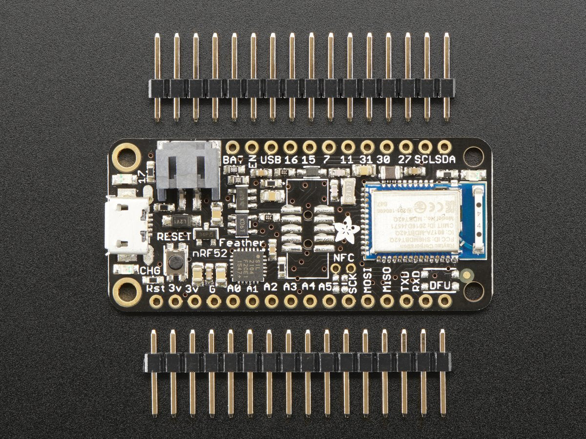 ARM Cortex M4F (with HW floating point acceleration) running at 64MHz 512KB flash and 64KB SRAM Built in USB Serial converter for fast and efficient programming and debugging Bluetooth Low Energy compatible 2.4GHz radio (Details available in the nRF52832 product specification) FCC / IC / TELEC certified module Up to +4dBm output power 1.7v to 3.3v operation with internal linear and DC/DC voltage regulators 19 GPIO, 8 x 12-bit ADC pins, up to 12 PWM outputs (3 PWM modules with 4 outputs each) Pin 17 red LED for general purpose blinking Power/enable pin Measures 2.0" x 0.9" x 0.28" (51mm x 23mm x 8mm) without headers soldered in Light as a (large?) feather - 5.7 grams 4 mounting holes Reset button Optional SWD connector for debugging