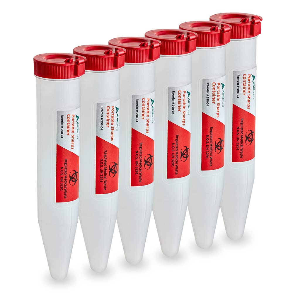 The disposal of needles and other sharps waste is a public health and safety issue. Sharps must be properly disposed of, to prevent injury as well as the spread of diseases to healthcare workers, patients and the general public.Made using sturdy polypropylene plastic for long-lasting strength and durability, this AdirMed Sharps and Needle Disposal Container ensures secure disposal of sharps waste. The bottom, like the rest of the container, is puncture- resistant to eliminate the risk of catching sharps' stings. Additionally, a leak-resistant cap provides a secure containment between uses to protect against of sharps waste.This simple receptacle is designed to allow one-handed operation, making it easy to open and close the disposal lid. Its conveniently sized for easy transport, making it ideal for use in situations such as EMS, fire/rescue, ambulance or psychiatric units.In addition to medical use, these containers are also ideal for diabetics and people with chronic diseases who often require injections at home. And since sharps of any type should never be thrown away in the trash – even those that are used in a home – this container provides a safe place to dispose of their waste.An ideal solution for short- term containment of used sharps, the AdirMed is sold as a convenient, 6-count package so you can have several on hand. Providing secure disposal of used IV catheters, smaller syringes and other sharps waste, this disposal container also features a locking mechanism to secure the contents during transports.