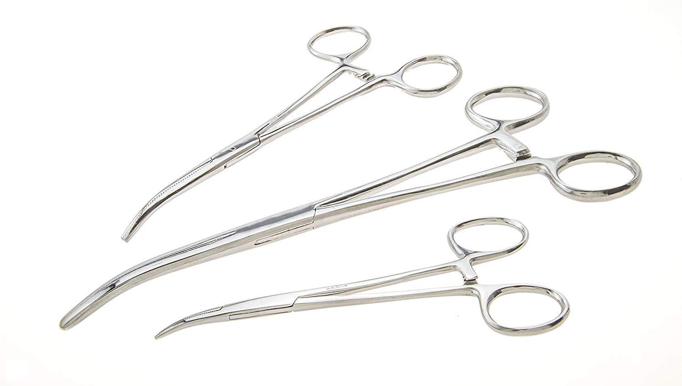 - Forceps Curved hemostat sizes: 8", 6.25" and 5"