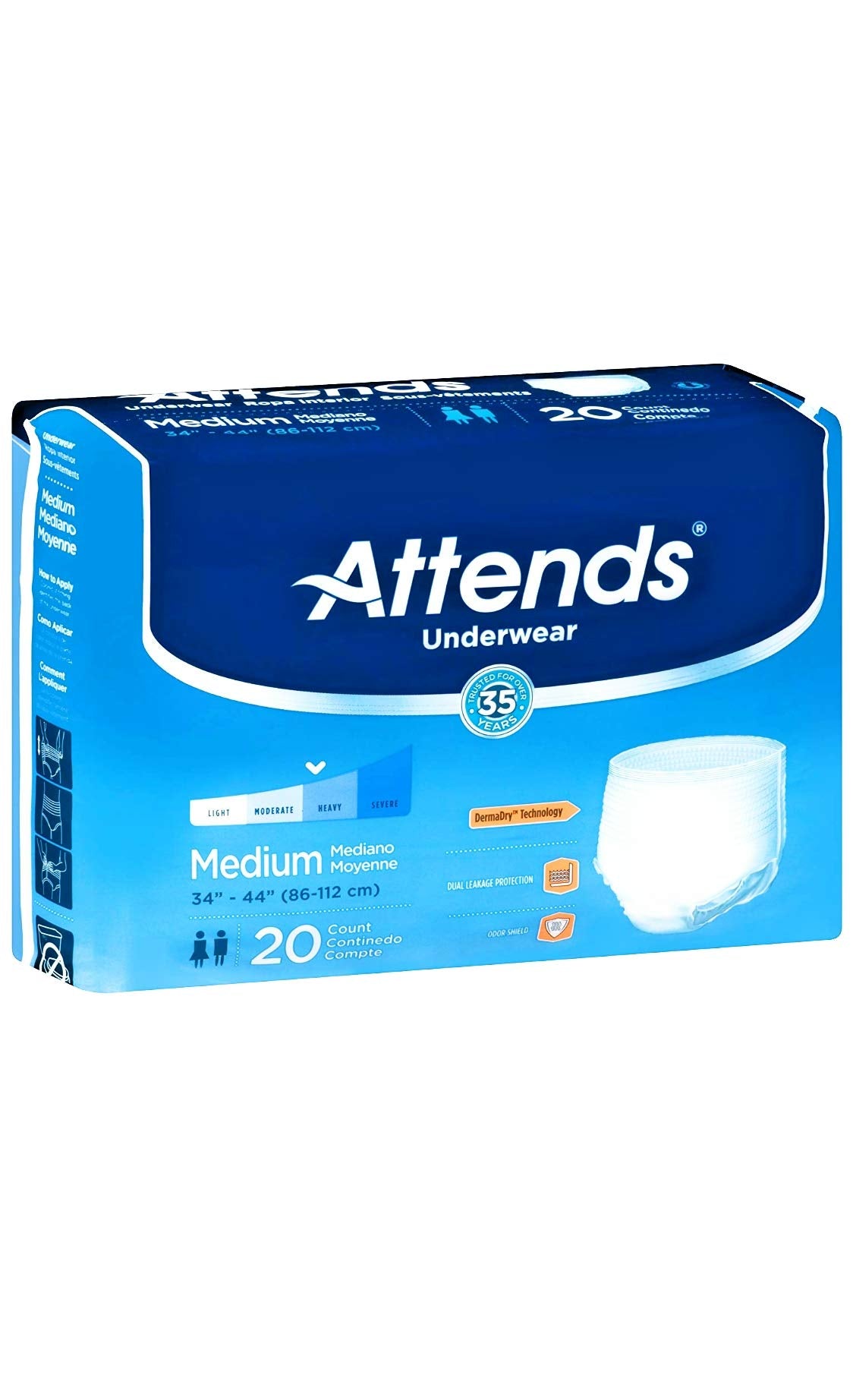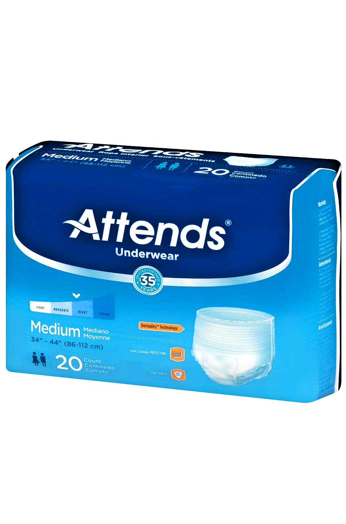 Intended to be used by adults weighing from 120 to 175 lbsDesigned to be worn under clothing like regular underwearDermaDry technology with Single Core Plus locks fluid away from the skinBarrier leg cuffs for added leakage protectionOdor-blocking properties help eliminate unpleasant scentsTear-away side panels for fast and easy removal