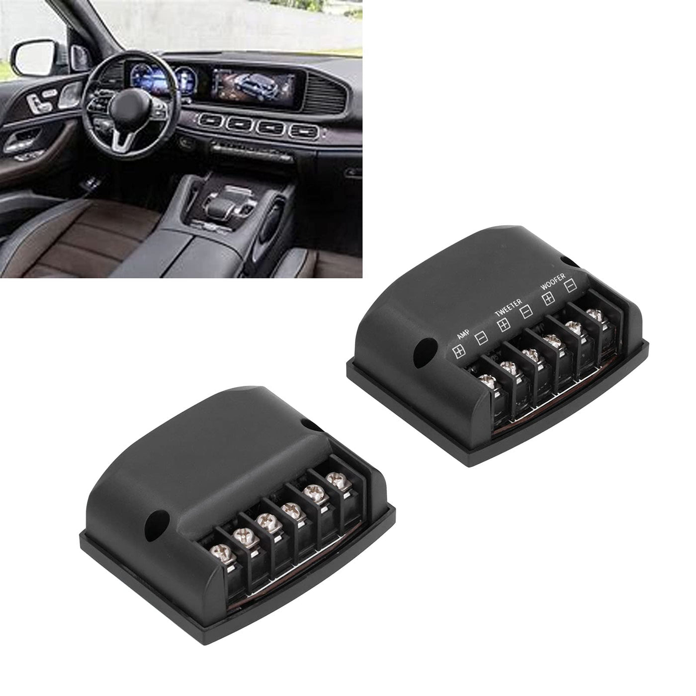 1. Come with reasonable line and high standard components, help to get correct sound. 2. High gloss double heat deflection dissipating ABS plastic shell is with beautiful, generous and bright colors. 3. Bass inductor and polymer magnet greatly improve bass sag. Exquisite finish and very sophisticated materials. 4. Overcurrent protection device is equipped with high frequency capacitors, an excellent sound enhancement tool. 5. Easy to use, just connect the corresponding wiring, then tighten the screws immediately. Spec: Item Type: Speaker Frequency Divider Material: ABS + Metal Colour: Black Voltage: 12V Power: 60W Application: Universal How to Use: First connect the audio cable to the crossover input, then connect the crossover bass to the woofer, and the crossover tweeter to the tweeter. PackageList: 2 xSpeaker Frequency Divider