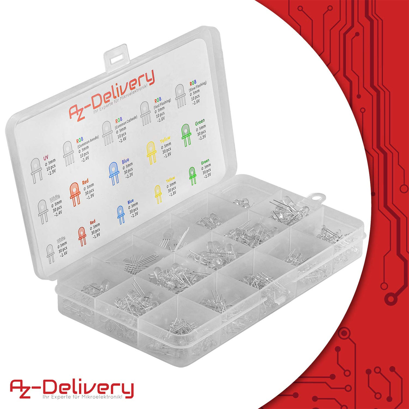 AZDelivery LED light diode assortment kit, 350 pieces, 3mm & 5mm, 5 colors, emitting round LED diode set, UV RGB CC/CA compatible with Arduino including e-book!