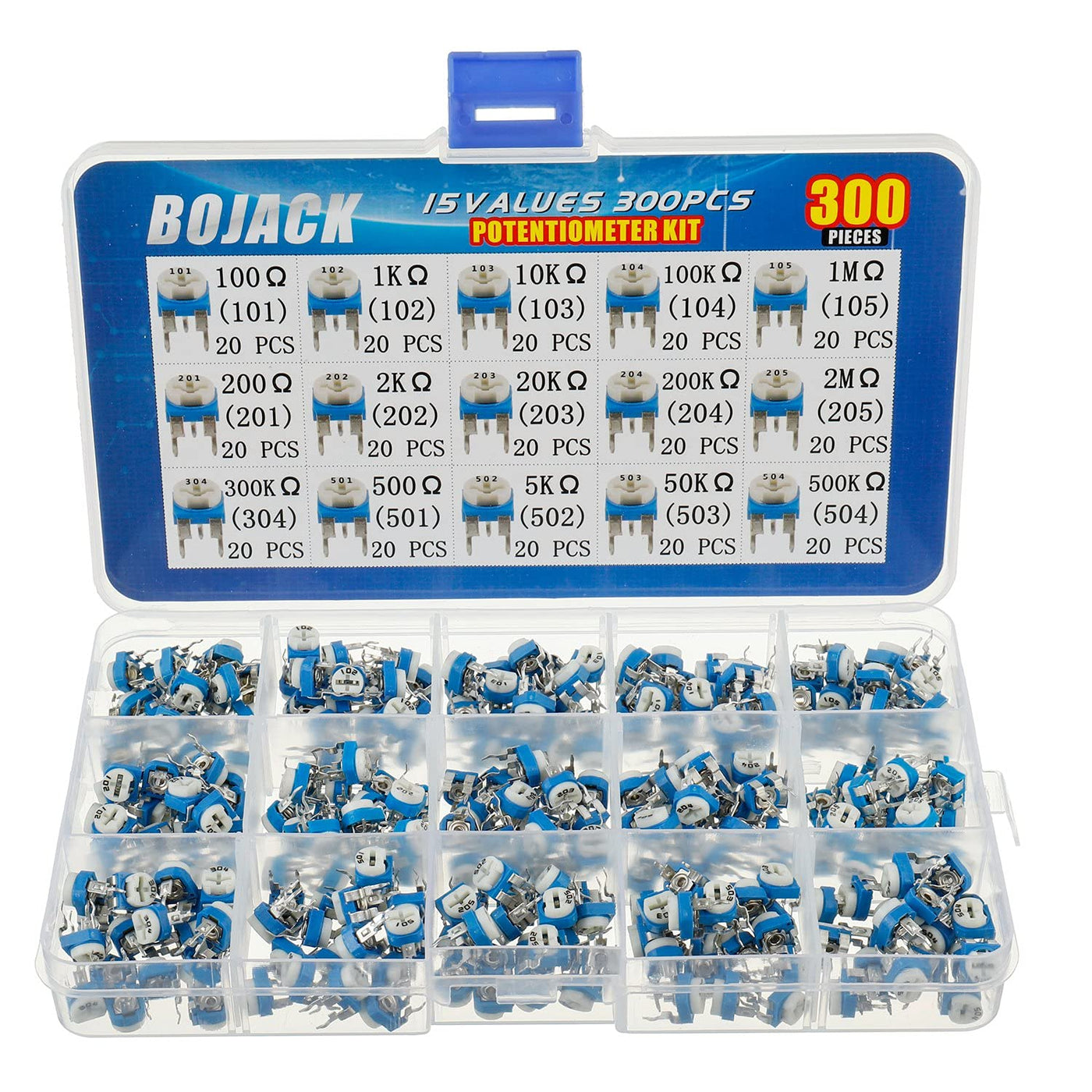 BOJACK 300pcs High Quality 6mm Potentiometer Assortment with variable resistance Mechanical characteristics: Rotation angle: 200 ° ± 20 ° Torque: 60 ~ 150g.cm Holding force: 500g.cm Power: Plug-in method: Horizontal Resistance range (Ohm): 100 ~ 2M Ohm Resistance deviation: ± 20% Rated power: 0.1 W Maximum operating voltage: 50V Resistance change characteristics: B Residual resistance: no more than 5% of the rated resistance, maximum 30Ω Rotation life: After 100 revolutions without load, the resistance changes up to ± 15% Load life: Load rated power for 3 hours, resistance change up to to ± 5% Product description: 101 -------- 100Ω ---- 20 pieces 102 -------- 1 KΩ ----- 20 pieces 103 -------- 10KΩ ---- 20 pieces 104 -------- 100KΩ -- 20 pieces 105 -------- 1MΩ ----- 20 pieces 201 -------- 200Ω --- - 20 pieces 202 -------- 2KΩ ------ 20 pieces 203 -------- 20KΩ ---- 20 pieces 204 -------- 200 KΩ - 20 Piece 205 -------- 2MΩ ----- 20 pieces 304 -------- 300KΩ ---- 20 pieces 501 -------- 500Ω ------ 20 pieces 502 -------- 5KΩ -------- 20 pieces 503 -------- 50KΩ ------ 20 pieces 504 -------- 500KΩ ---- 20pcs