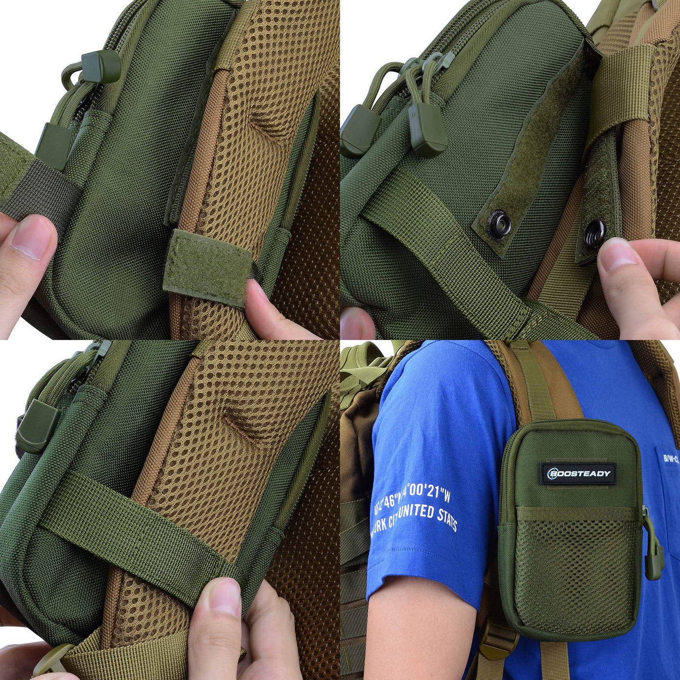 It is very inconvenient that when you need to access something on your back, you have to stop, shed your bag, search for the items, and then repack. That, or stop and ask the person behind you to rustle through your bag. BOOSTEADY shifts the storage from your back, to the front of your body. This makes the often-used items more accessible as well as secure. Read more Product Feature Dimensions: 4.5x7x2 inches. Constructed by rugged nylon material and water-resistant inner lining lead! Excellent workmanship. Constructed of durable nylon. Lightweight and water-resistant. Quick dry feature. It is simple to connect to backpack strap. This strap pack can be installed on either right or left shoulder strap. Large capacity pocket. It is very easy to put items in and take out. The zippers are solid and smooth. Army green pouch with 4 inch Mod strap and hook & loop fastener closing straps: With firm and safe snaps on the back. It will not lean or move. Read more The backpack attachment bag with 4" MOD strap on the back could be securely attached to tactical backpack shoulder strap, equipment belt or other tactical gears as an extra exterior pouch. Double layers design and mesh pocket work great for separating items and for storing cell phone, tactical pen, keychain, digital cameras, medical supplies, ammo, snack or any essential you need. Read more Package Includes 1 X Army Green Pouch with 4” Mod Strap Read more