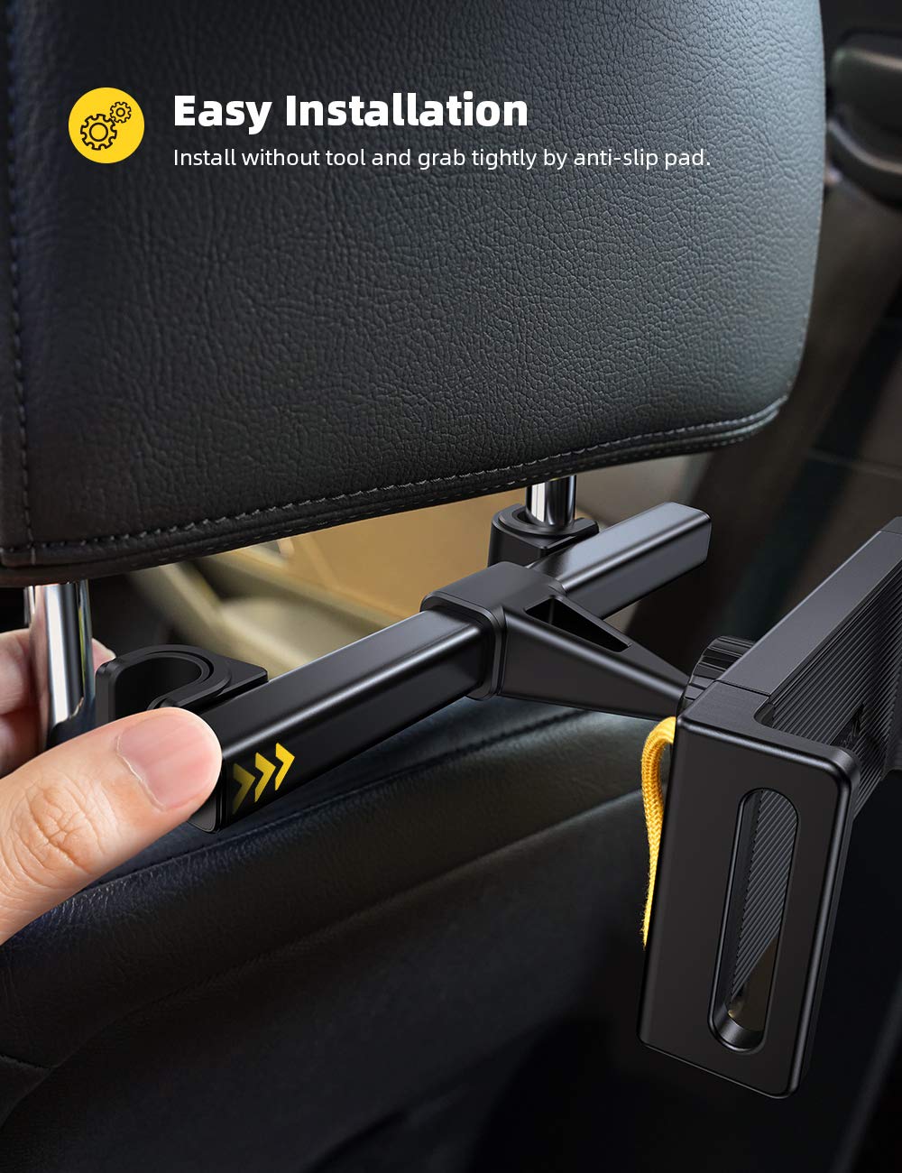 - 360 Rotatable & Easy Installation 360 degree rotation allows you to rotate any angle you desired, you only need adjust the expandable leg of backseat headrest mount, so it can be installed immediately.