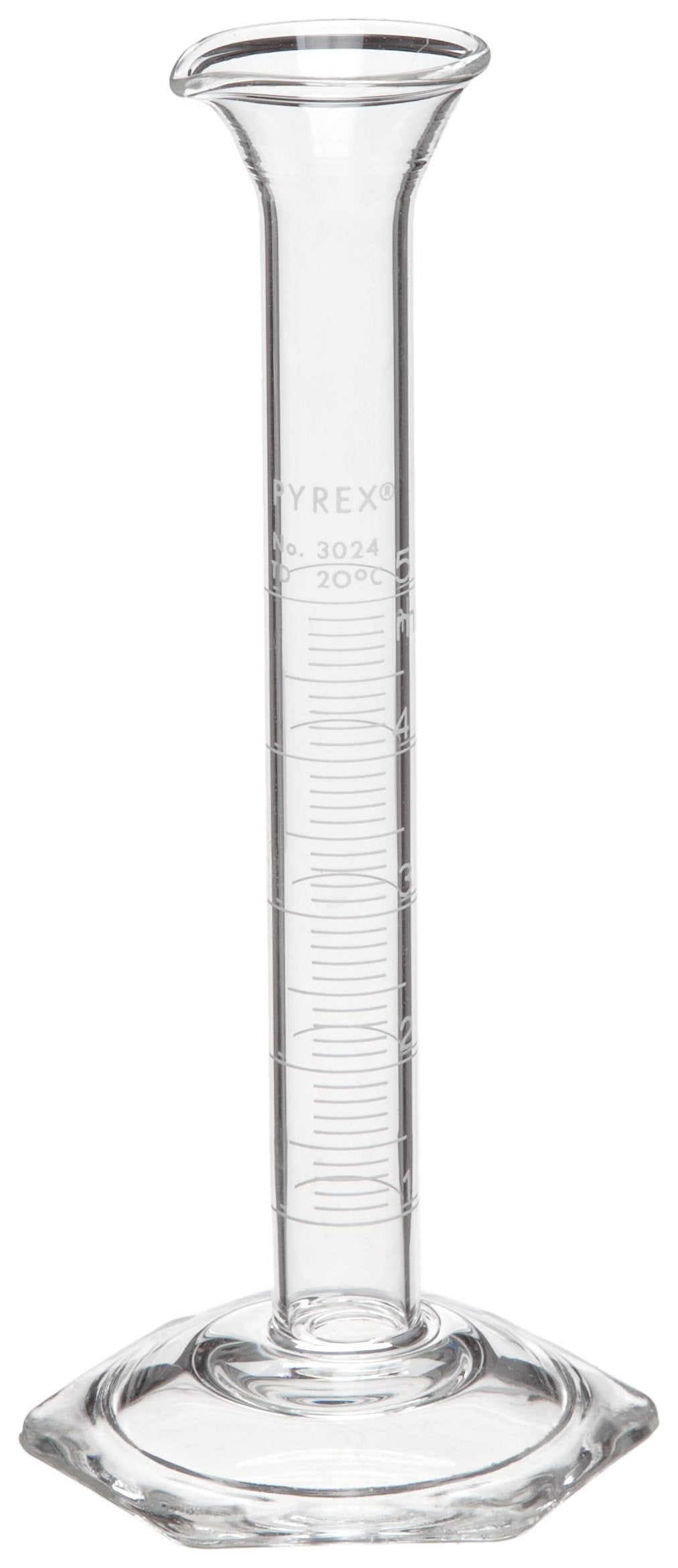 Corning Pyrex 25mL graduated cylinders are single-metric calibrated "To Deliver" (TD) and have white enamel graduations. Height: approximately 192mm. Outer Diameter: approximately 18mm. Graduation interval: 0.2mL. Tolerance +/-: 0.3mL. Not sterile. Borosilicate Glass Code 7740. Pourout top. No stopper. Supplied with plastic bumper guards to reduce accidental breakage (for replacement bumper guards see Cat. No. 3066). Corning : 3024-25.