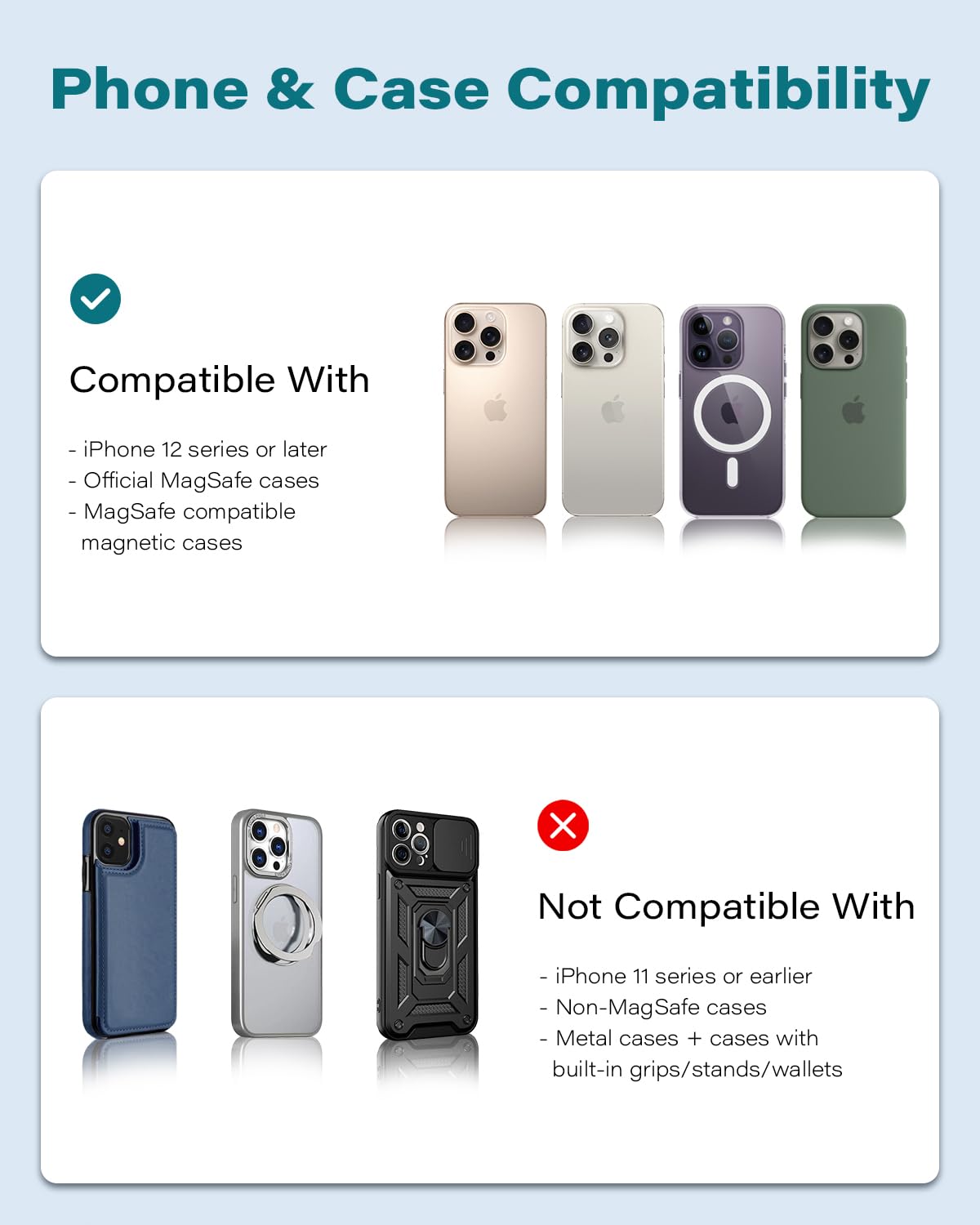 - Magnetic Car Charger for iPhone Series: This magnetic charger mount is ONLY designed for iPhone 17/16/15/14/13/12/series. This car phone holder allows automatic charging your phone without case or with MagSafe case. If you use other smooth-surface cases, please stick the included metal ring to the outside of the case.