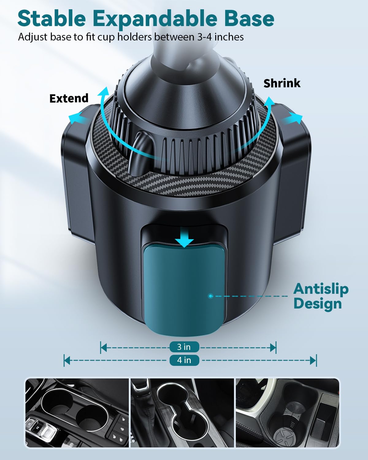 - Stable Expandable Cup Base: The cup base is easily adjusted from 3" to 4" with just a twist of the knob, fits most car cup holders. The phone holders for your car cupholder fits snugly into car cup holders like Tesla without rattling or making noise while you drive.