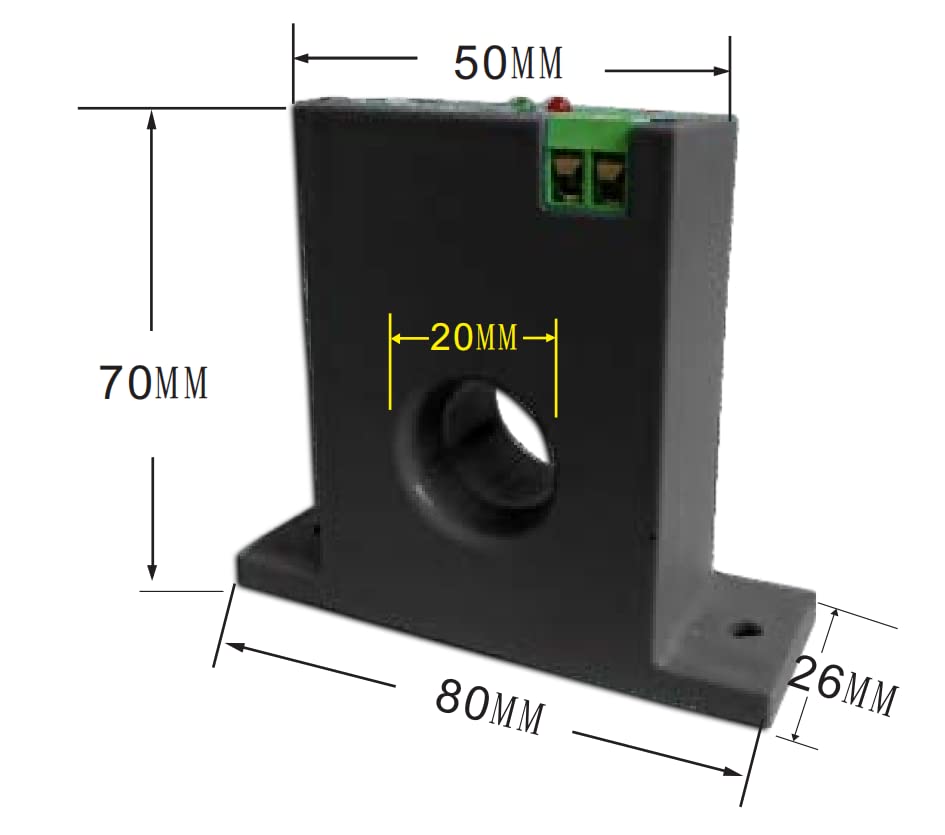 - Normally open current sensor: When the perforation line current exceeds the set value, the red light is on and the output signal is closed; When the current is below the set value, the green light lights up and the switch is open