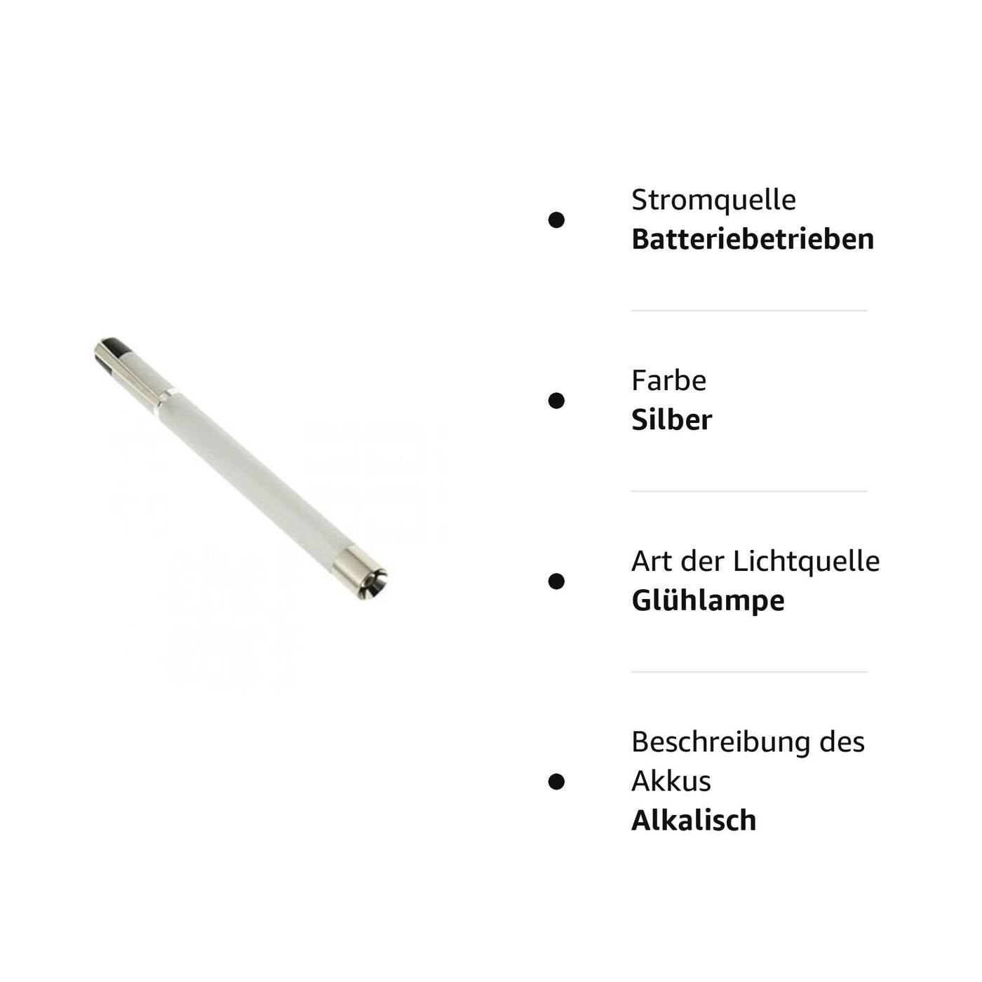 Product details: Penlight in a simple, elegant design with the fast CLIP MOMENT CIRCUIT Housing made of high-quality, ANODIZED ALUMINUM Light source is a LIGHT BULB (pointed lens bulb E10 with 2.2V and 0.25A) Including high-quality ALKALINE BATTERIES Brand VARTA Made in Germany Also suitable for EYE and THROAT DIAGNOSTICS Light bulbs are more sensitive to shocks or falls than LED bulbs MADE IN GERMANY Areas of application: Medical aid for eye and throat diagnostics.Our diagnostic light is suitable for eye examinations (pupillary light).Suitable for indoor and outdoor activities, such as use in: workshops, garages, caravans, boats, cars, sheds, gardens, construction sites, fishing, hiking, jogging, climbing, camping , cycling, walking with the dog, working around the house, emergency repair work during power outages, animal supplies (veterinary), model building and as a hobby tool (craft supplies).Technical data: Lighting time: 5 h + Switching mechanism: clip-moment switching Weight: 34g Dimensions: Length 135 mm Ø 12 mm Lamp life: Rated value 5h Operating voltage: 2.2 V Luminous intensity: 0.25 A Material: anodized aluminum Power supply: 2 x 1.5 V Battery type: AAA, Micro, LR03, R03, AM4Safety: Medical device class 1 in accordance with Directive 93/42/EECDisinfectable aluminum housingManufacture: is made in Germany Materials are sourced in GermanyEach individual diagnostic light goes through an extensive quality test