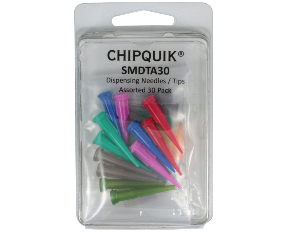 30 industrial dispensing needle tips. 1/2" length. Fits most standard syringes, including 5cc, 10cc, and 30cc. Fits all Chip Quik flux and solder paste syringes: ->Search Chip Quik base part numbers: SMD291, SMD4300, and SMDLTLFP Sizes (Gauge) - Qty - Color: Straight Stainless Steel Tips: 16g - 2 pcs - Black 18g - 2 pcs - Green 19g - 2 pcs - Brown 20g - 2 pcs - Pink 22g - 2 pcs - Blue 23g - 2 pcs - Orange 25g - 2 pcs - Red 26g - 2 pcs - Black 27g - 2 pcs - White Conical Plastic Tips: 14g - 2 pcs - Dark Green 16g - 2 pcs - Gray 18g - 2 pcs - Green 20g - 2 pcs - Pink 22g - 2 pcs - Blue 25g - 2 pcs - Red Please note: plastic color of each size tip may differ from table or image. Arrange tips in order of size (largest to smallest opening) to determine individual tip gauge and select the appropriate tip for your application.