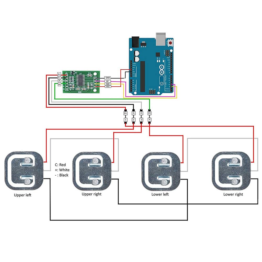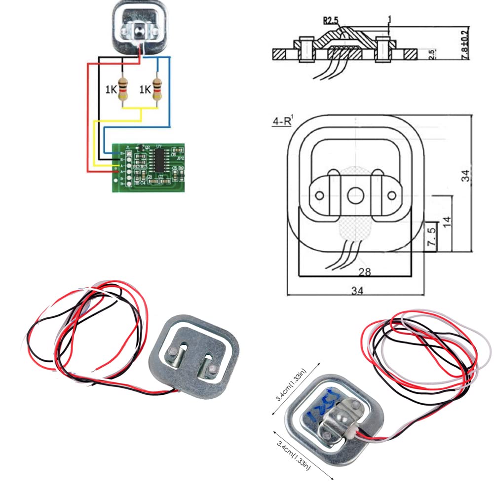Load cell is an instrument that helps to determine size of a load (either a force or weight) and converts mechanical force into digital output. It consists of a metal core and a set of electrical resistances that transform when a force is applied to it. But it returns to its original state after force removed. It have many purposes, including telling weight of something, weight change over time and measure strain and load on a surface. It's perfect for electronic scales, digital scales, electronic balance and many commercial scales weight involved. To use a load cell, you need first calibrate it where you can increase or decrease calibration factor units to get your correct weight using a microcontroller. Frequently Asked Question Q:What is the range of output? how low will it accurately go? i need accuracy to at least 200g, preferably lower A:The accuracy depends mostly on the ADC resolution, 24Bit in the case of standard HX711, accuracy will be better than 200g even with 50KG load cell, it will be in the order of few grams at most Q: How accurate can I measure items? If I use more than one cell does the accuracy improve or degrade? A: this type of cell, which is 50kg half bridge will provide a typical accuracy of 50 to 100g with a maximum range of 200K for 4 cells. Adding more cells will increase the maximum load and decrease accuracy. Read more Using a Single Load Cell 1x50kg by Adding 2 Resistors -Connect outer wire(white and black) of load cell to E+ and E- outputs of hx711 module. -Connect middle cable(red) of load cell to A+ input of hx711 module. -Connect two 1k resistors to A- input of hx711 module. Then the other end of resistor to white and black wires. -Connect GND of hx711 module to board GND, and VCC to board 5V pin. -Connect DT and SCK of hx711 module to any digital IO pins of board. Using Two Load Cells in a Singel Circuit 2x50kg (100kg) -Connect opposite sides of outer wires(white and black) of two load cells. -Connect outer wire pairs to E+ and E- output of hx711 module. -Connect middle wire(red) of load cell to A+ and A- inputs of hx711 module. -Connect GND of hx711 module to board GND, and VCC to board 5V pin. -Connect DT and SCK of hx711 module to any digital IO pins of board. Using 4 Load Cells in a Single circuit 4x50kg (200kg) -Form a loop by linking same color outer wires(white and black) of the four load cells. -Connect middle cable(red) of one of the diagonals to the E+ and E- outputs of the HX711 module. -Connect the other diagonal to the A+ and A- inputs of the HX711 module. -Connect GND and hx711 module to board GND, and VCC to board 5V pin. -Connect DT and SCK of hx711 module to any digital IO pins of board. Read more 400 Breadboard LoRa ESP32 OLED Jumper Wire Alligator Clip to PH Cable Package List 1 set breadboard+power module + cable 1 set 0.96 oled display esp32 lora 1 set alligator clip wire 2 sets 2p 3p 4p cable
