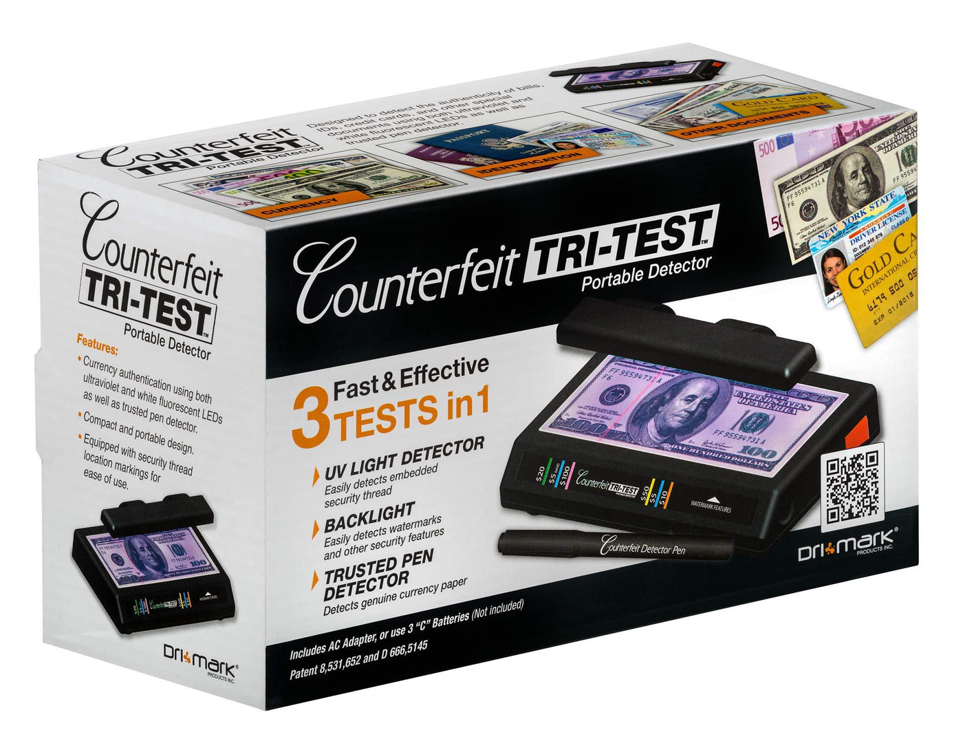 Dri Mark's patented Tri Test is the first ultra portable, fully functioning counter-top counterfeit detection device based on the newest LED technology. Three simple tests to authenticate US money take just seconds, and provide the highest degree of protection against counterfeit including bleached bills. UV light reveals the security thread, back-light reveals watermark portrait, and the classic Counterfeit Detector Pen authenticates currency paper. The Tri Test operates on 3"C" batteries or the included AC adapter. At less than 8" wide and 4" deep, it takes up almost no space, and can easily fit where other machines cannot.