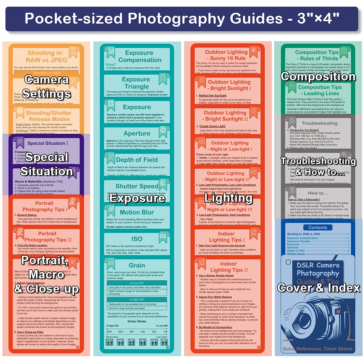 - Must-Have Camera Accessories - Includes 30 pages of the most useful photography tips, these 16 double-sided DSLR cheat sheets are color-coded. Suitable for any camera model, Canon, Nikon, Sony, etc.
