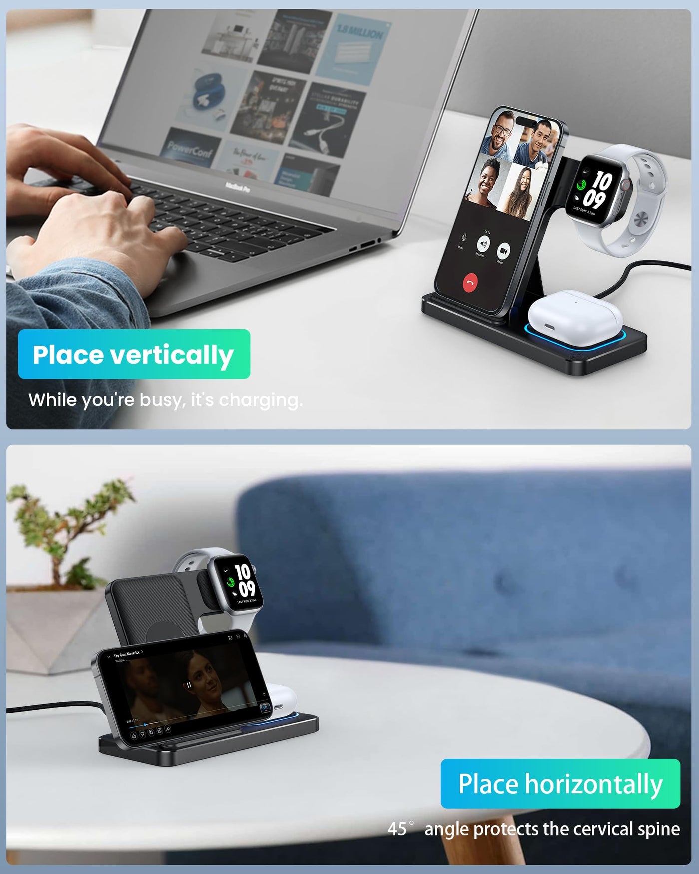 - 3-in-1 Wireless ChargerCompact and foldable, this 3-in-1 wireless charger is the same size as an iPhone 14. Charge your iPhone, Apple Watch, and AirPods simultaneously. A must-have wireless charger for Apple fans