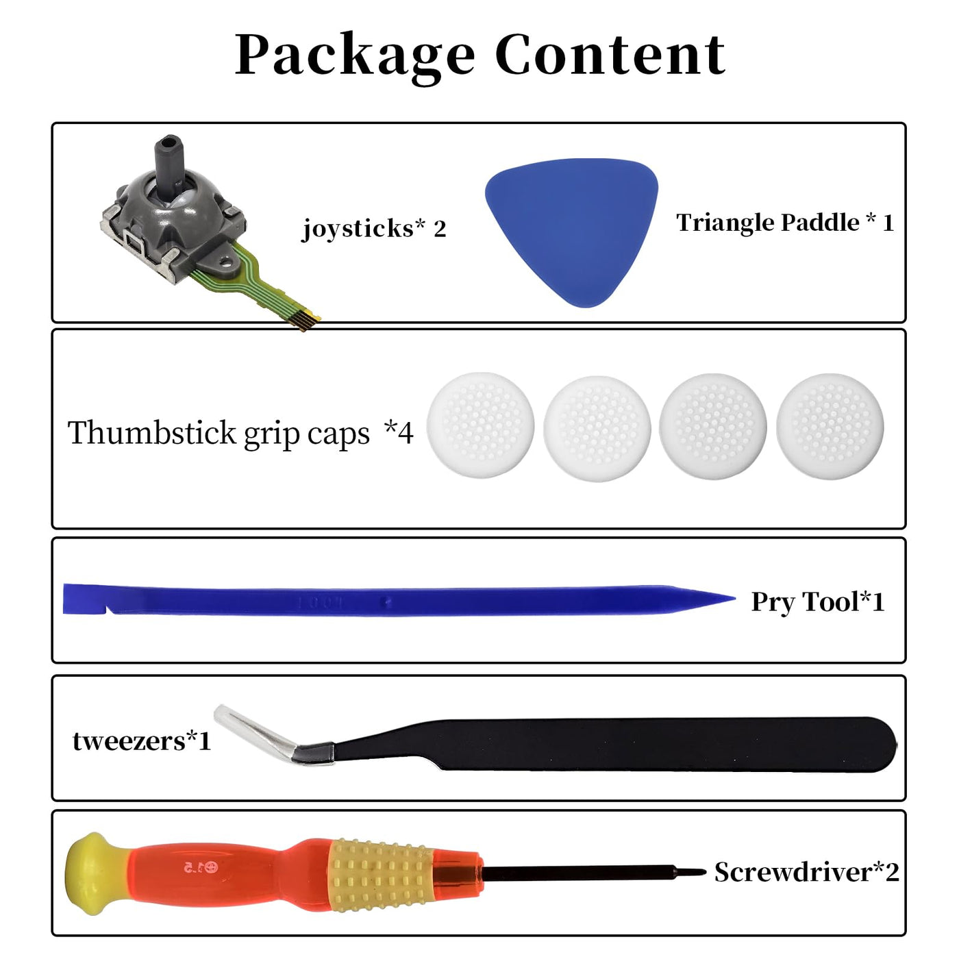 - Comes with set tool:2x Joystick 2x Cap silicone protector 1x 1.5 Philips Screwdrive 1x 1.5Y Screwdriver,Opening Tool,1xPry Tool and Tweezer.