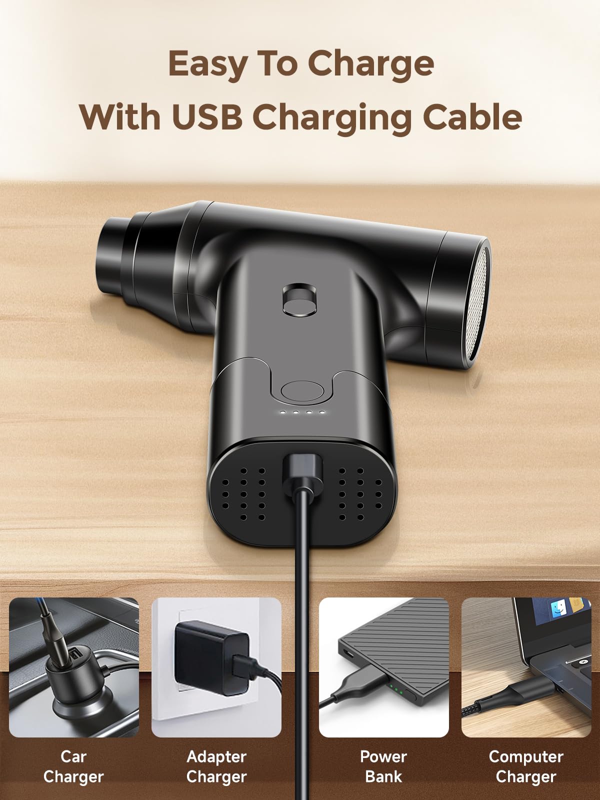 - Alternative to Compressed Air: Compared to air can, our cordless air duster can be recharged and used repeatedly, avoiding waste. No liquid or ice will form during the cleaning process. It can protect your electronic products . And the dust blower is equipped with a C-type data cable (without adapter), which can be fully charged in just 2.5 hours. The usage time is 15-120 minutes, and the wind speed can be adjusted through buttons according to different usage scenarios.