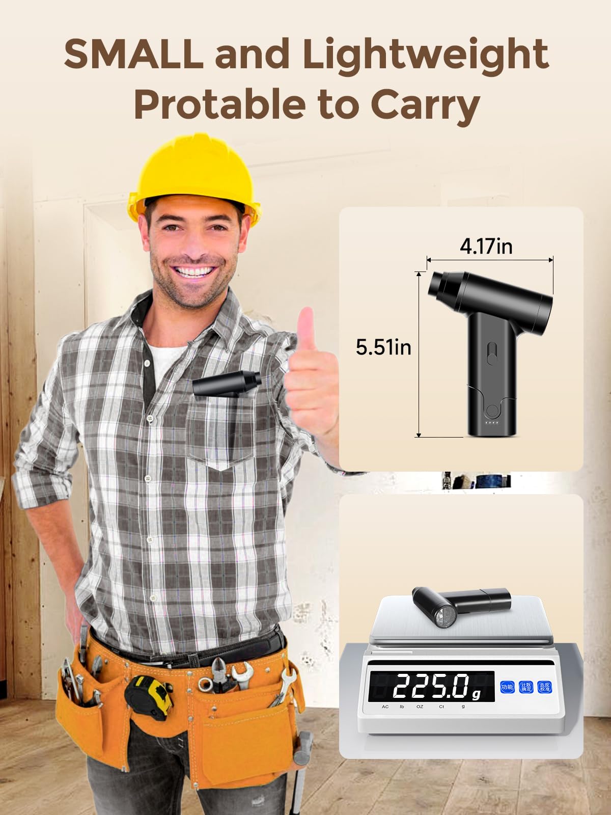 - Portable Electronics Duster: Compact design, lightweight and mini, size for 4.1 inches * 1.4 inches * 5.5 inches. Jet Dry Blower 's weight is only 225g,the size of a palm. It can be easily placed in pockets, drawers, or inside cars, and cleaned of dust and debris anytime, anywhere.