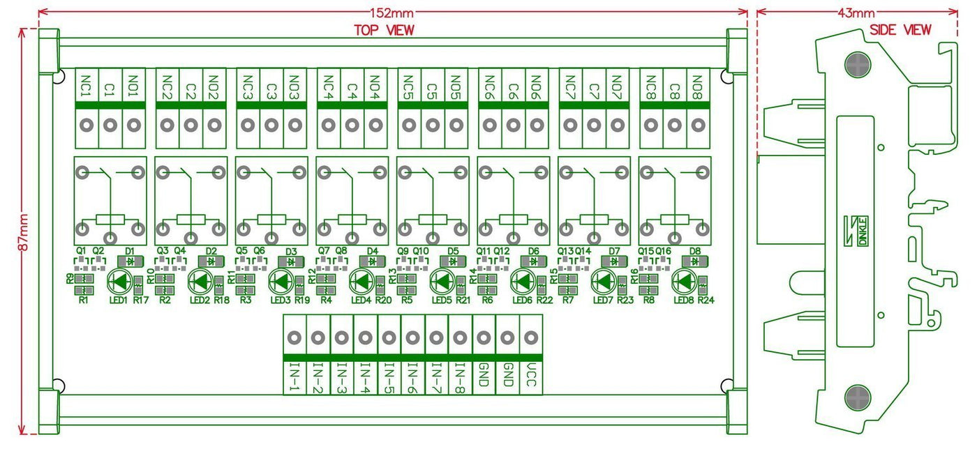 DIN Rail mount 8 Channel 10Amp SPDT Power Relay Module, DC 5V Version. JS1-5V-F Power Relays. LED indicator for each relay channel. Darlington transistors circuit driving relay, improve the reliability of action. DIN rail mount carrier: High quality Taiwan DINKLE fireproof nylon material DIN rail mount carrier (not China low quality carrier), can support width 35mm / 32mm / 15mm rail. FR-4 fiber glass dual layers PCB. High quality terminal block: Pitch 5.0mm/0.197", Wire range 28AWG ~ 12AWG / 2.5mm square, Strip length 7mm. Screws - M2.5,steel,Cr3+ Zn plated. Pin header and Cage - Brass. External dimensions: 152 x 87 x 43mm(L x W x H).Operating Voltage / Current: DC 5V / 720mA. Input control signal voltage: 0V - 0.5Vdc, low level, relay not action. 2.5V - 24Vdc, high level, relay action. Input control signal high level current: 2.5V: 0.1mA. 5V: 0.35mA. 12V: 1.1mA. 20V: 1.9mA.Relay Specification: Part number: JS1-5V-F power relays. Contact Rating: 125VAC/250VAC 10Amp or 30VDC 5Amp.Wire connection: VCC: Power supply input. GND: Power supply ground and control signal ground. CH-x: Control signal input, Low: relay OFF, High: relay ON. COM / NO / NC: (Cx=COMx) . Control signal state low, the relay OFF, COM - NO disconnected, COM - NC connected. Control signal stage high, the relay ON, COM - NO connected, COM - NC disconnected.This is a very simple module board, no paper specifications, any questions, feel free to tell me. Datasheet