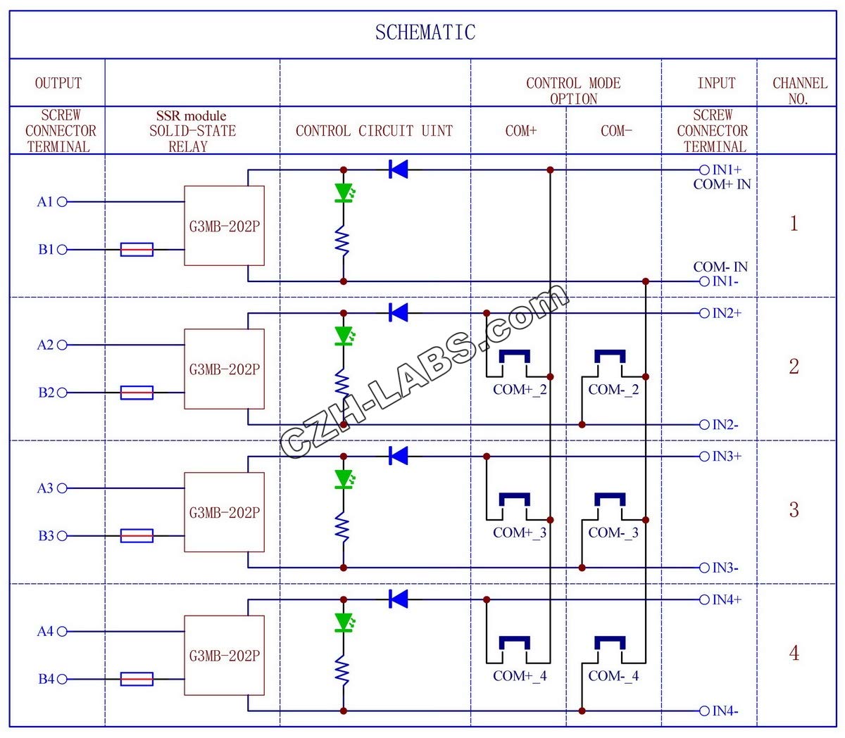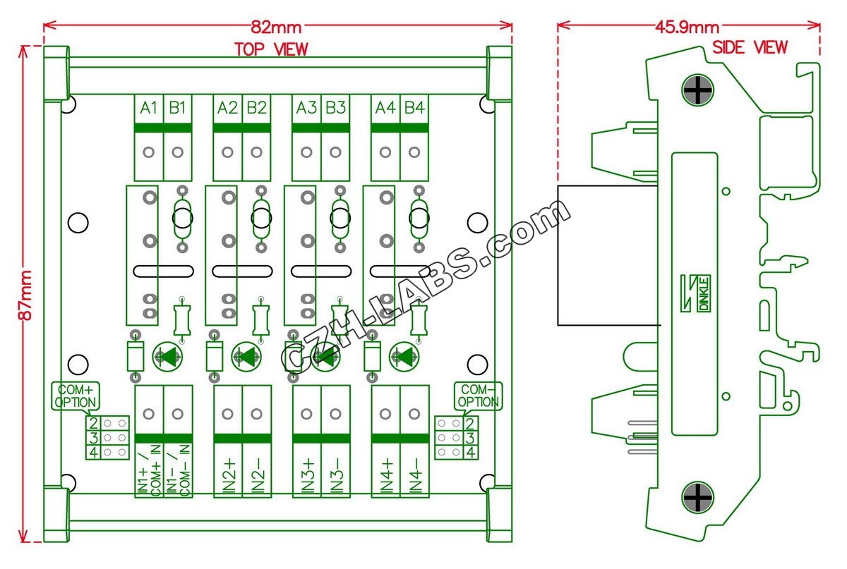 Electronics-Salon DC5V 4 Channels DC-AC 2Amp G3MB-202P Solid State Relay SSR Module Board. Input control voltage DC 5V, Current 20mA for each channel. LED indicator for SSR each channel action. Rated output voltage: AC 100 ~ 240V(50/60Hz). Applicable load current: 0.1 ~ 2Amp(each channel). Pin Jumper option for control mode configurations in common positive or common negative. SSR output series 3Amp fuse to protect your equipment. G3MB-202P 5VDC SSR, Isolation: Phototriac. Zero cross: Yes. Rated output load: 2A at 100 to 240VAC (50/60Hz). Load type: General purpose. DINKLE Fireproof nylon material DIN rail mount carrier (not China low quality carrier), can support width 35mm / 32mm / 15mm rail, and the carrier can be taken apart for panel mount use. High quality terminal blocks. Wire range: 24 ~ 12 AWG. Strip length: 7mm. Screws - M2.5 steel, Cr3+ Zn plated. Pin header and Cage - Brass. High quality FR-4 fiber glass PCB.