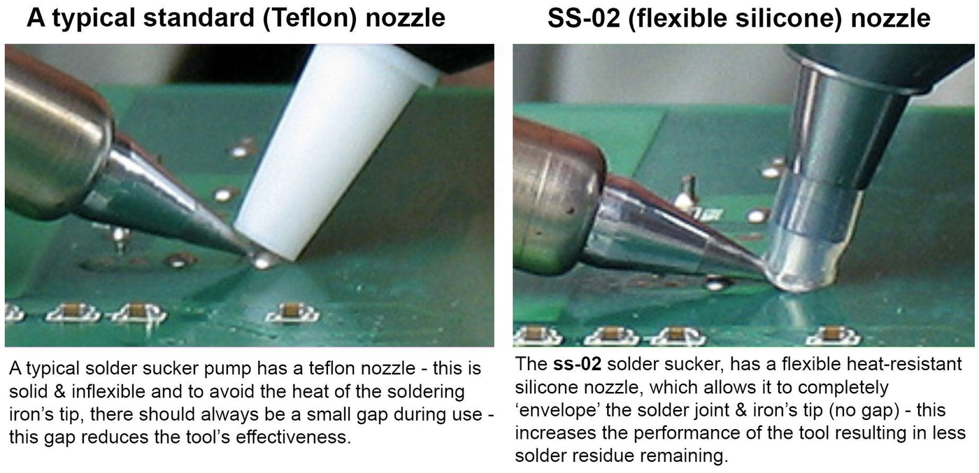 - Innovative silicone nozzle allows for close placement to the soldering iron tip (stronger suction for better desoldering).